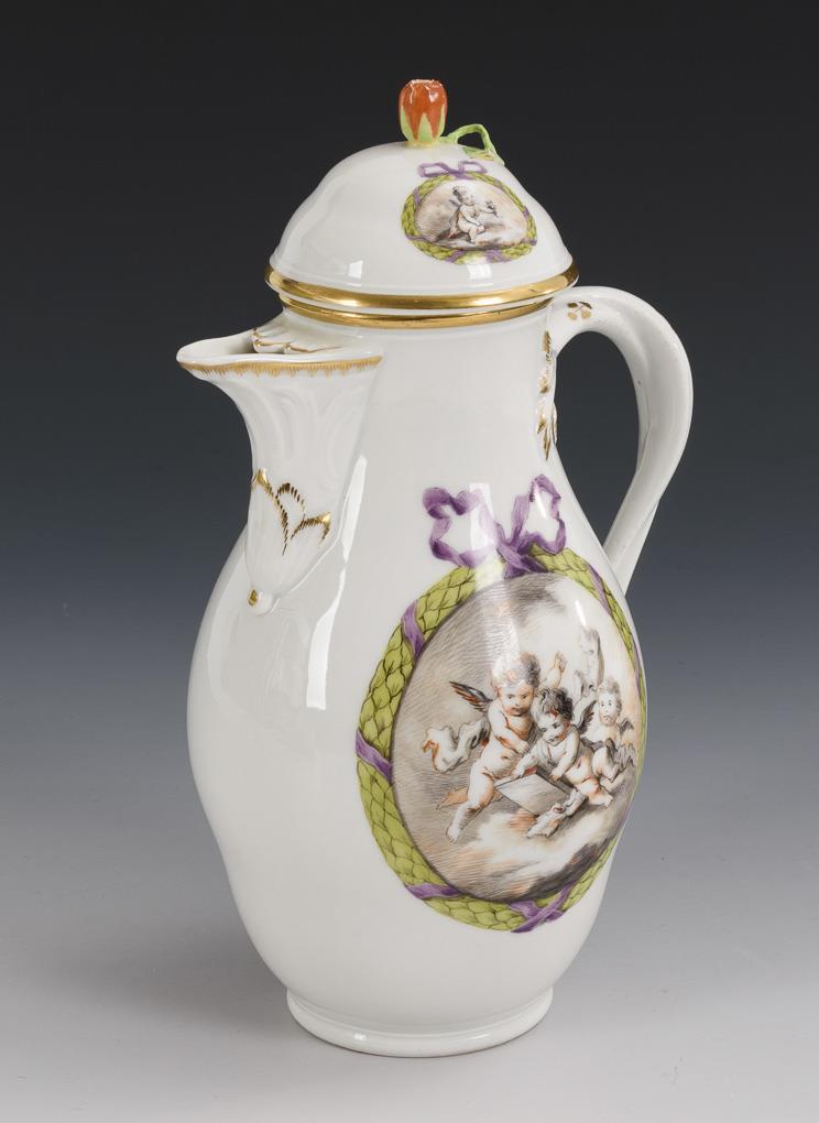 Pear jug with flower knob lid. On both sides a laurel wreath framed medallion with putti on clouds. Wall hairline crack, lid knob restored.