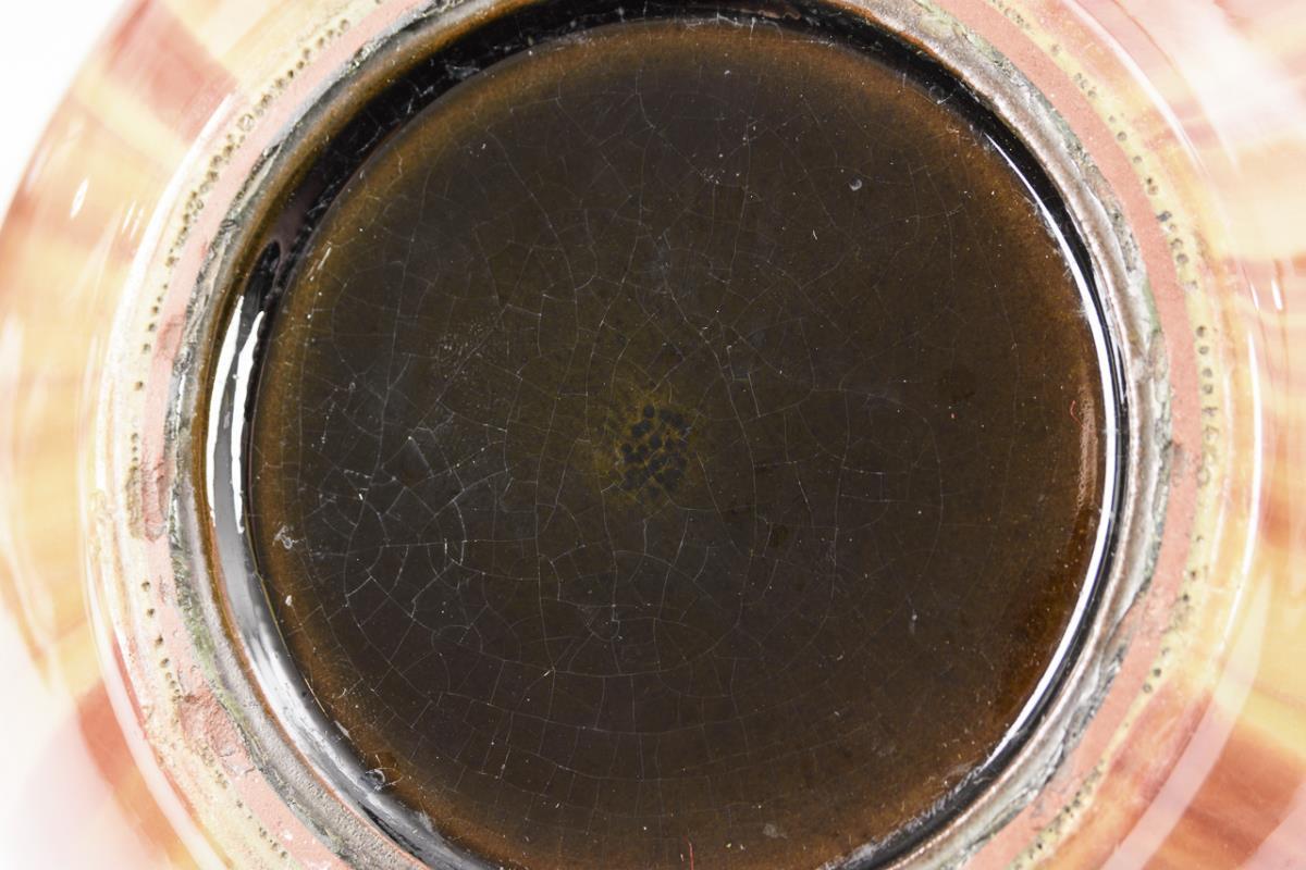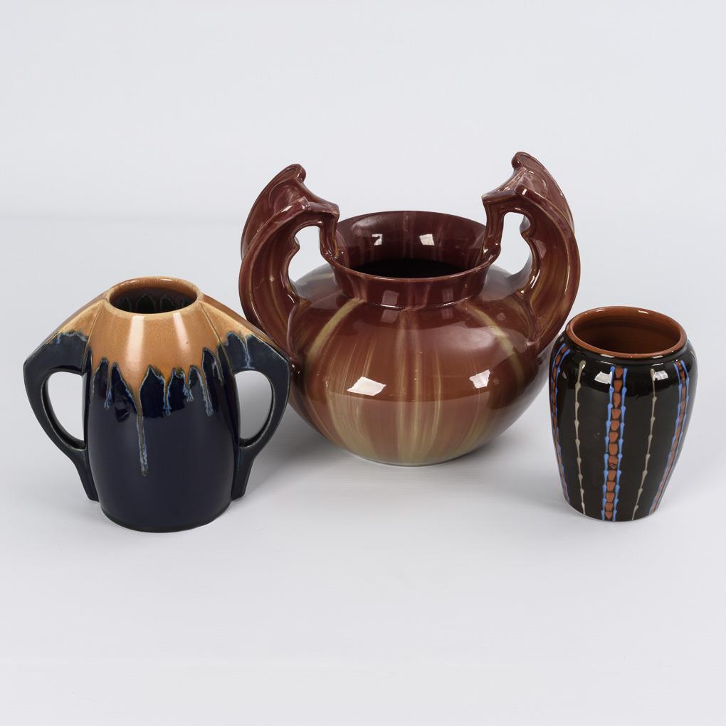 Bellied form with strongly exposed handles (h 22.5 cm), slender ovoid form with geometric handles set on the sides (h 17 cm), slender bulbous form with vertical stripe decoration (h 14.5 cm).