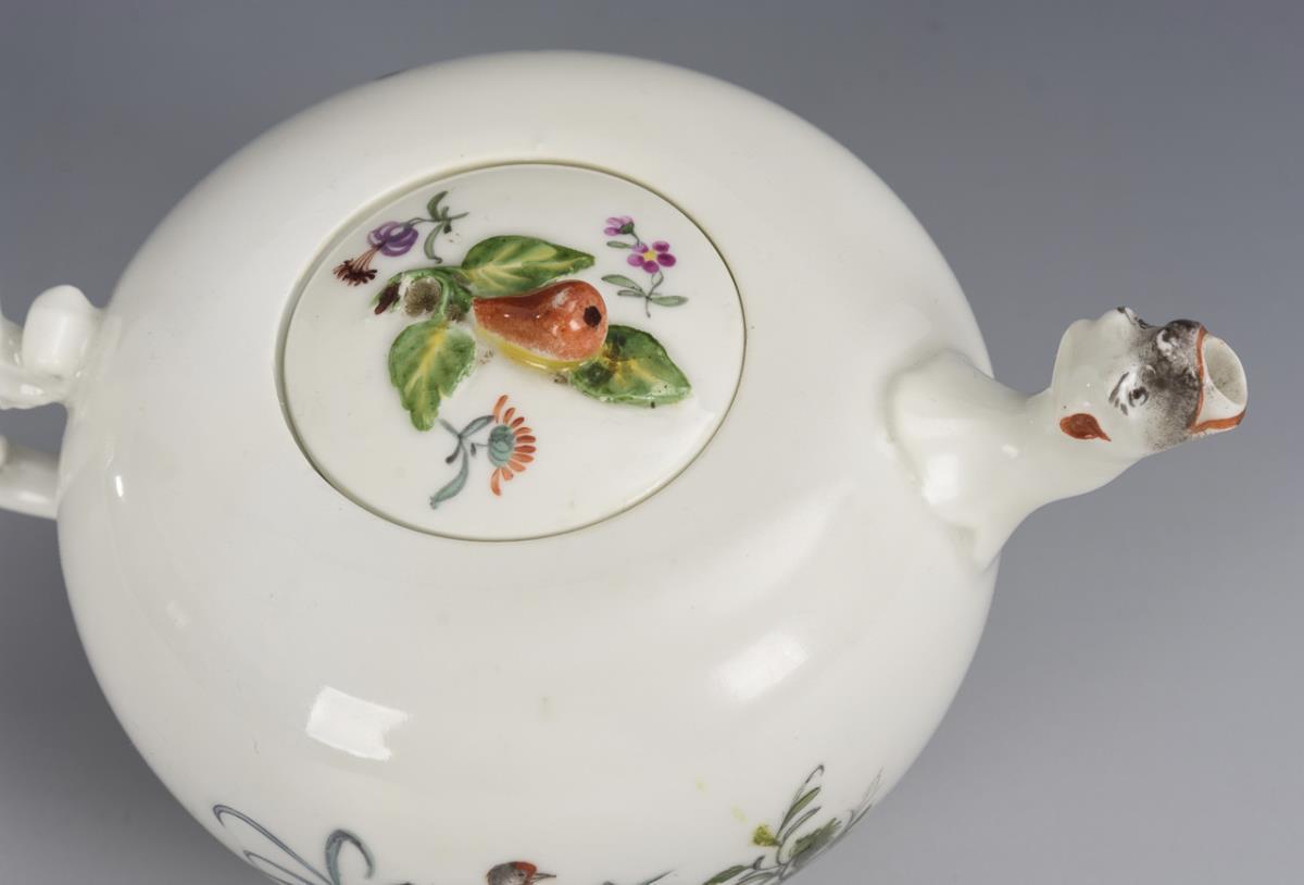 Bellied jug with rocaille handle, animal head tube spout and pear knob lid. Both sides depicting a landscape island with exotic poultry. Restored wall hairline crack.