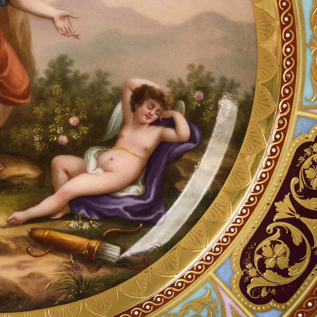 Plate with splendidly designed flag with pink, burgundy, turquoise and light blue partial background with ornamental gold relief painting and white enamel dots, in the mirror a mythological representation with a young couple, surprising the sleeping Cupid boy, on the underside the inscription "Mione and Cupid". Minimal gold abrasion.