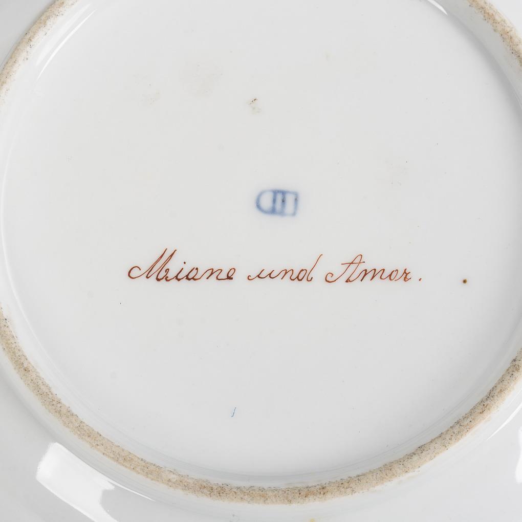 Plate with splendidly designed flag with pink, burgundy, turquoise and light blue partial background with ornamental gold relief painting and white enamel dots, in the mirror a mythological representation with a young couple, surprising the sleeping Cupid boy, on the underside the inscription "Mione and Cupid". Minimal gold abrasion.