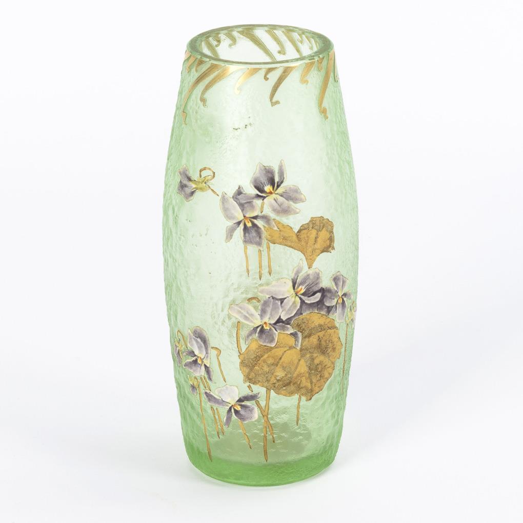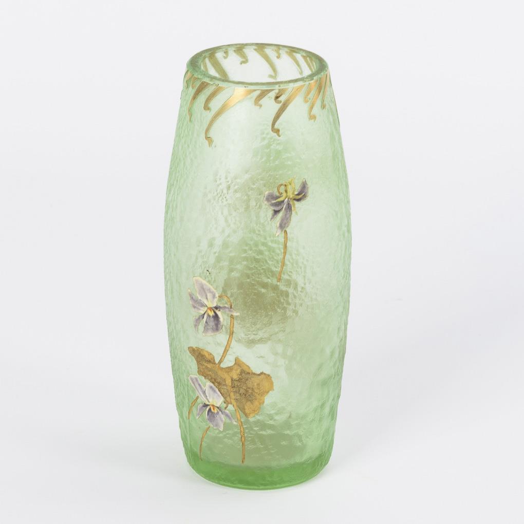 Colorless glass with green overlay, polychrome enamel painting, gold staffage; dislocated demolition. H 19 cm.