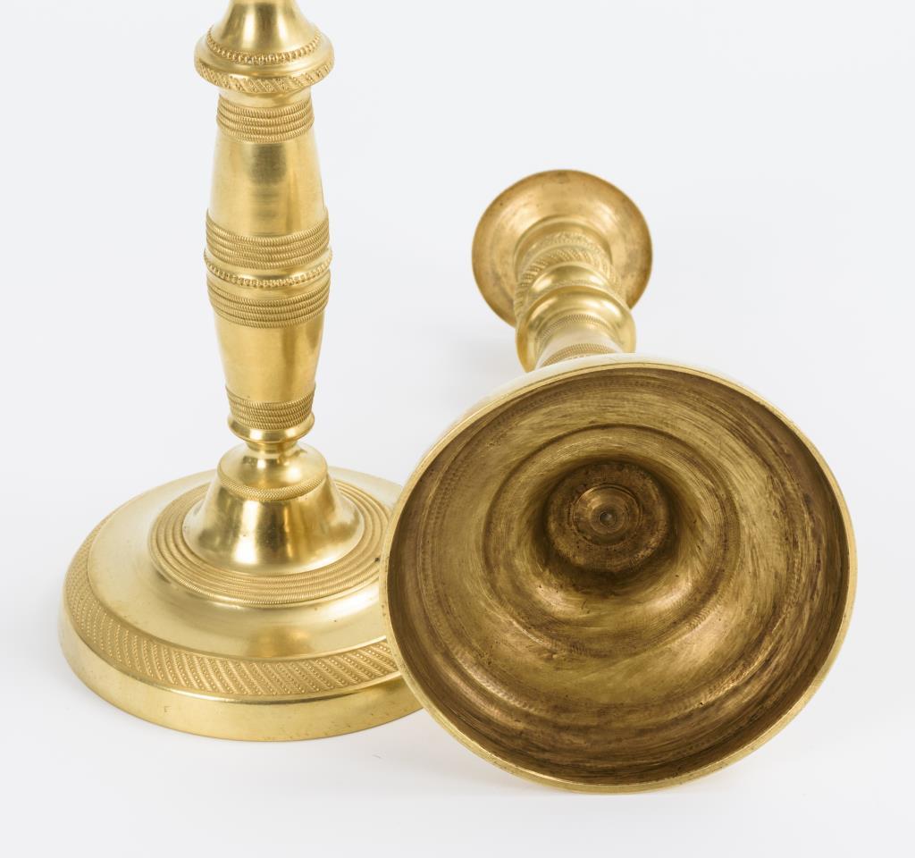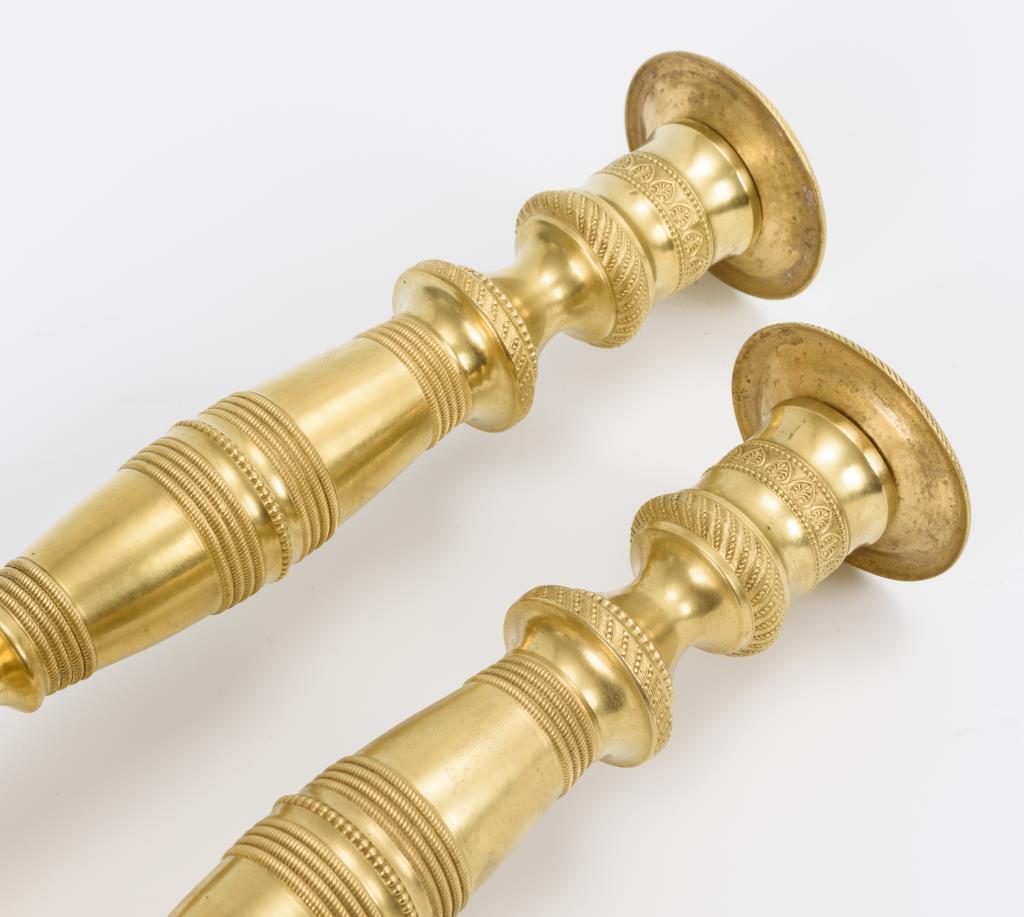 Bronzeleuchter mit sehr fein ausgeführten Zierfriesen. Rundfuß, stark gebauchtem Säulenschaft und Vasentülle.