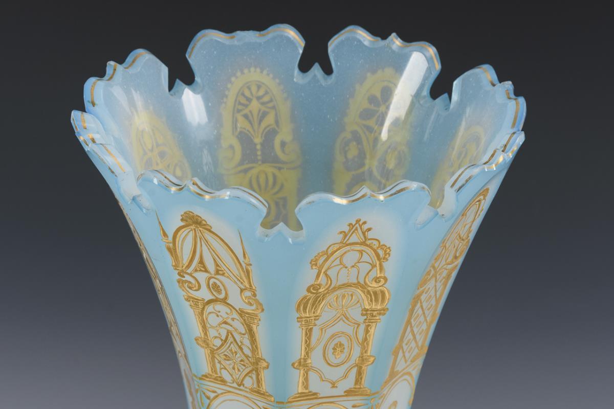 1x faceted footed vase of colorless glass with light blue overlay and gold relief painting. / 1x crater cup of colorless glass with pink inner rim, opal white overlay and colored and gold floral painting. Vase with rim and foot bumps.