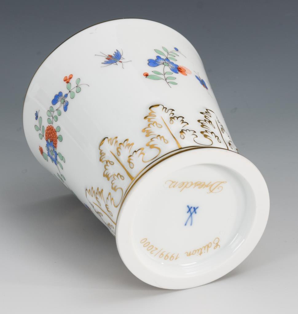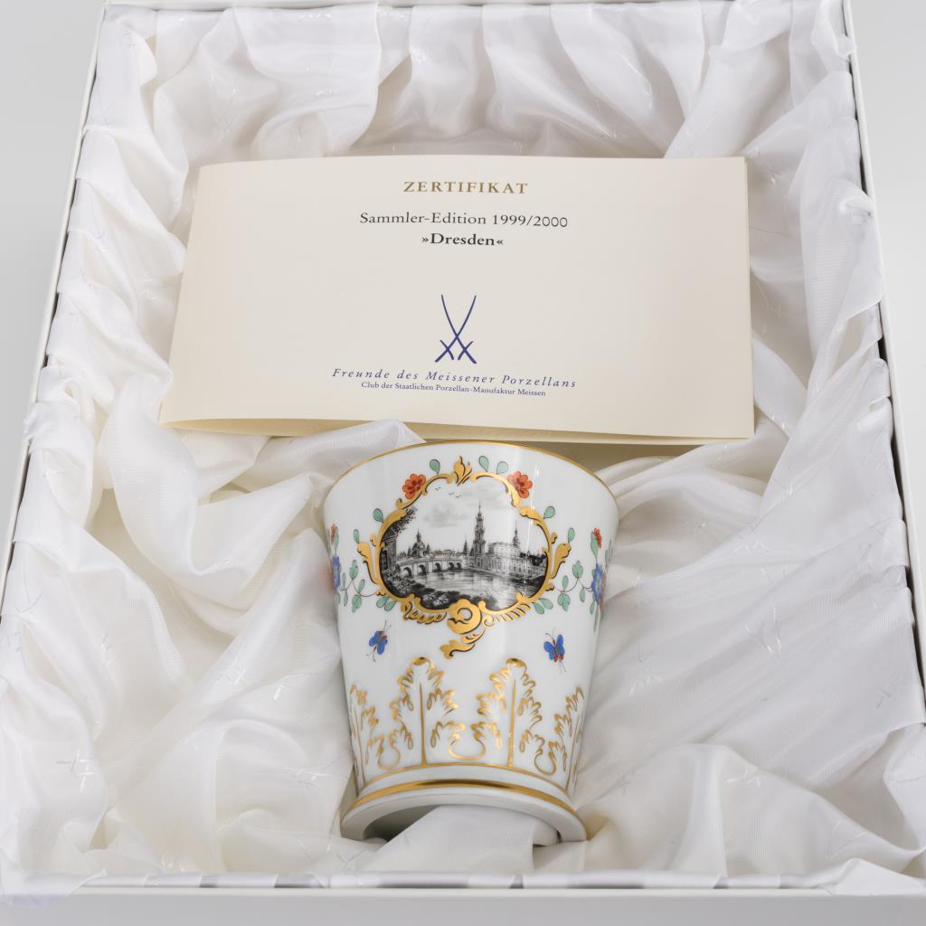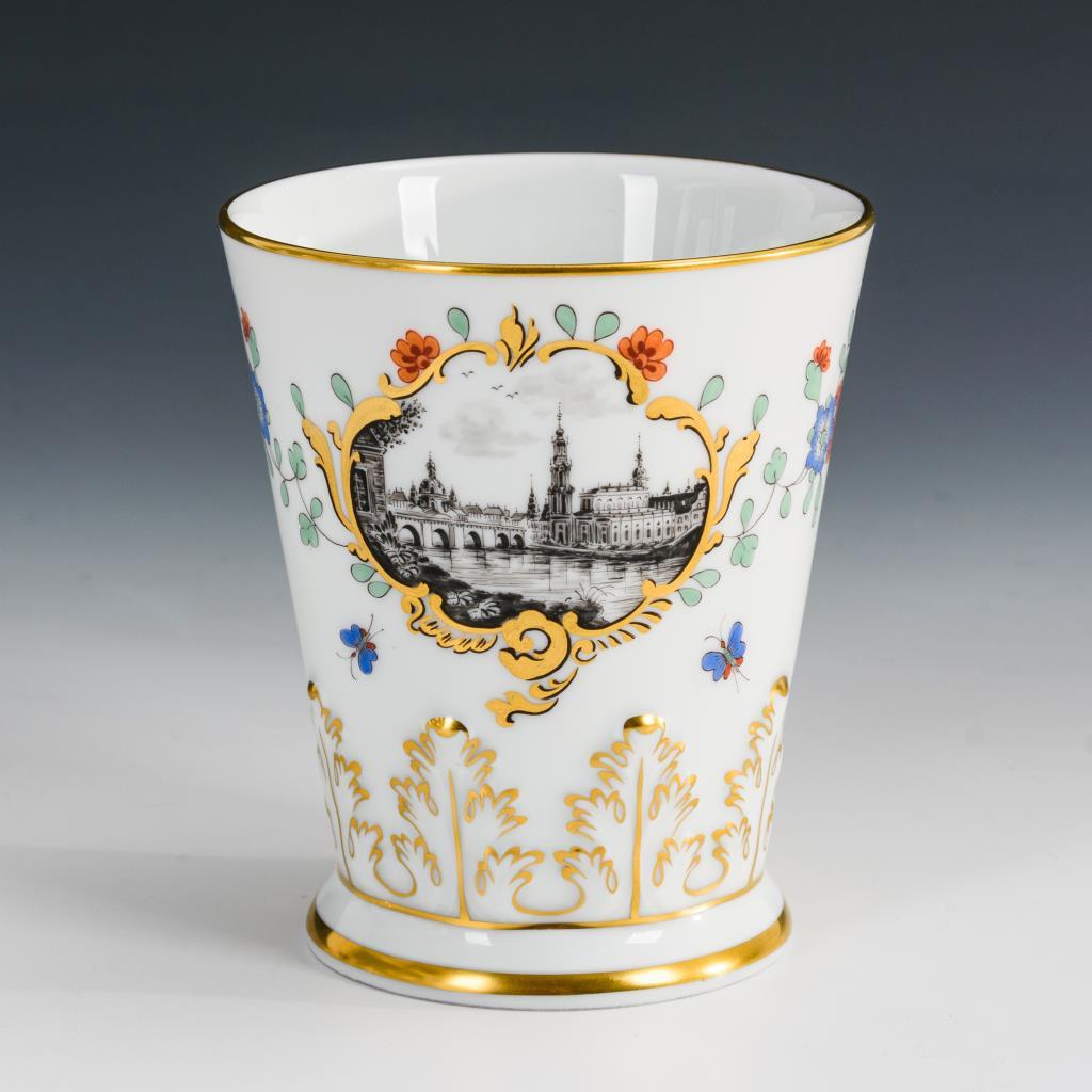 Konischer Becher mit Blattreliefkranz. Schauseitig eine Rocaillekartusche mit einer grisaillegemalten Dresden-Ansicht.