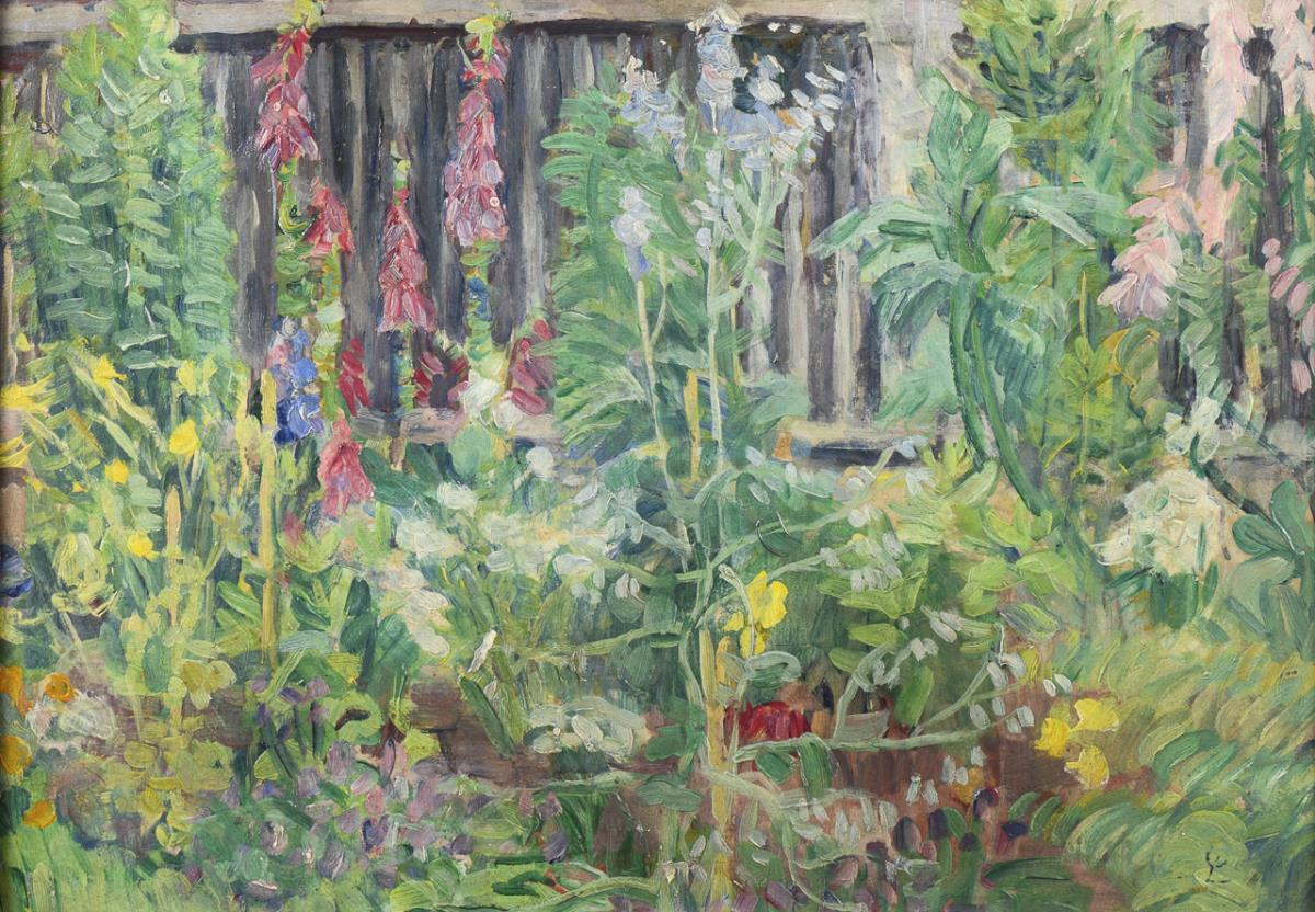 Blooming front garden with numerous flowers in front of a garden fence.