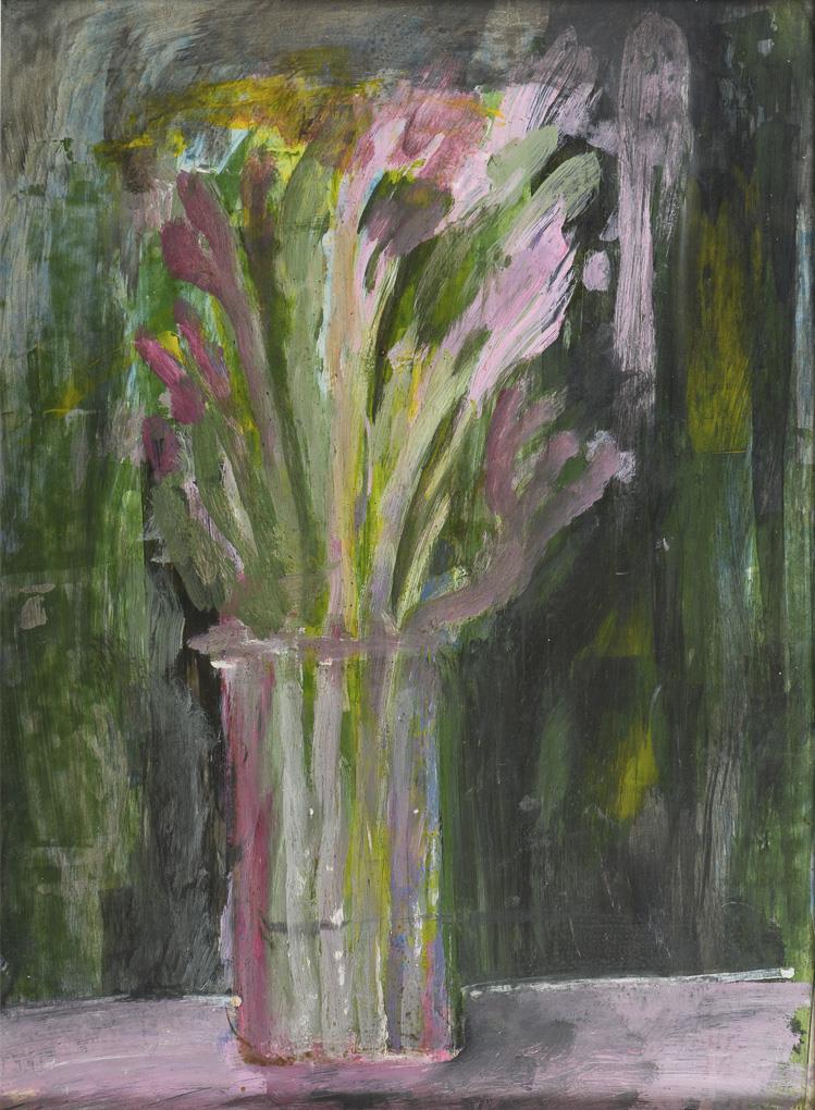 Schematically recognizable plant in tall vase.