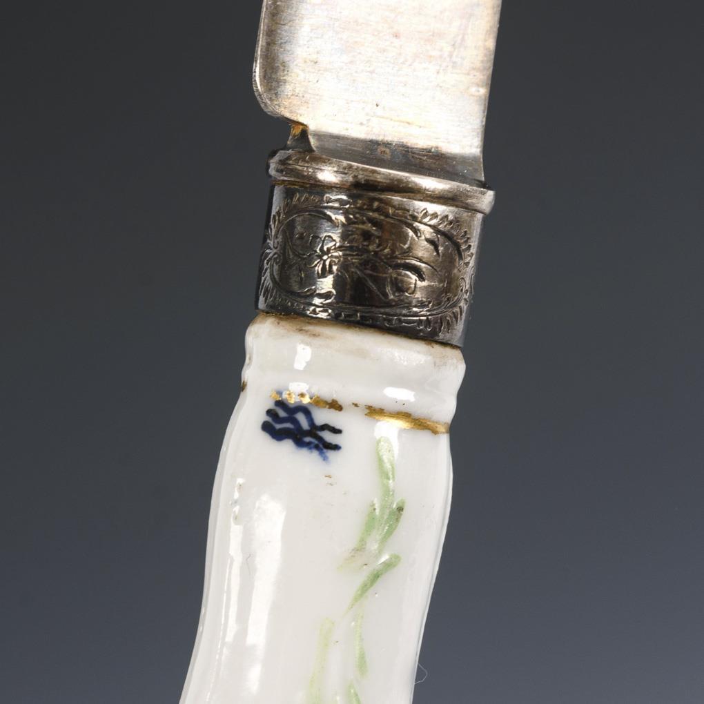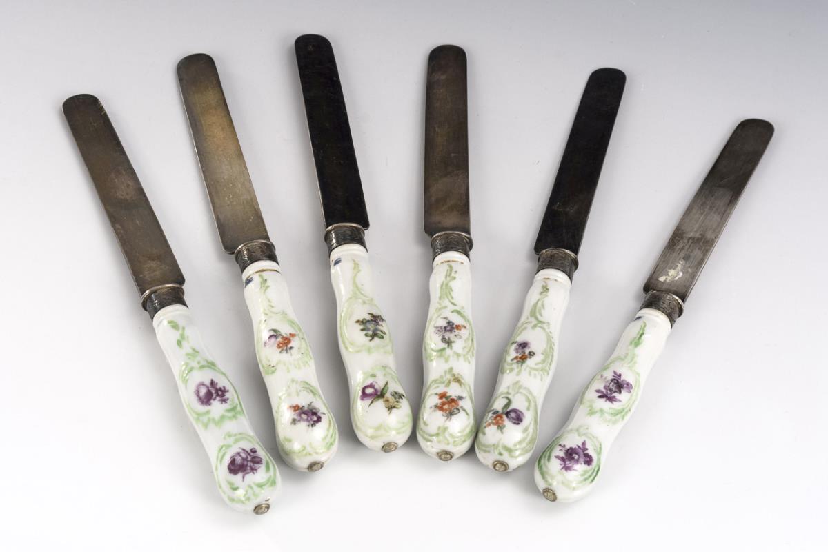 Baroque style knives with rocaillereliefed handles with floral painting, metal blades. Partially somewhat rubbed.
