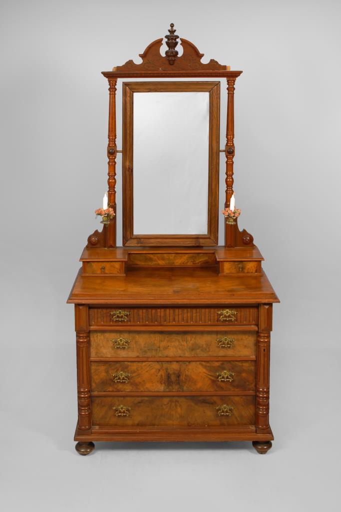4-schübige Kommode mit floral beschnitztem Kopfschub und vorgesetzten Balustersäulen, Spiegelaufsatz mit 2 kleinen Schüben und gedrechselter Halterung sowie Giebelbekrönung, Messingbeschläge und 2 Kerzenhalter. Alters-/Gebrauchsspuren.