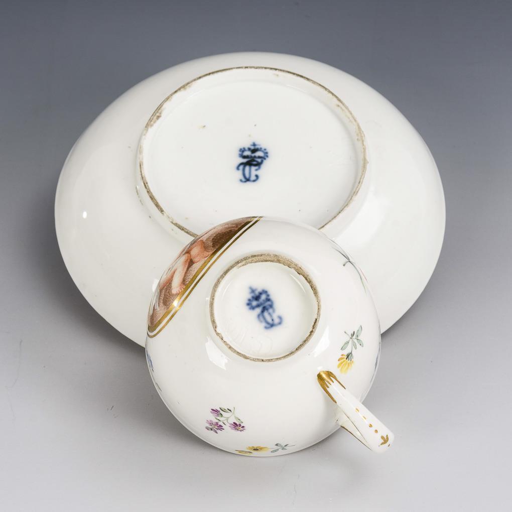 Polychrome painted, gold decorated. H cup 5,5 cm, Ø original saucer 14 cm.