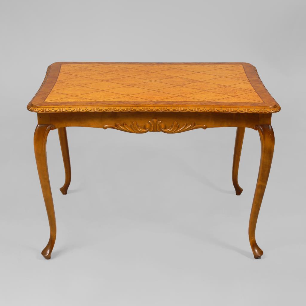 Höhen- und längenverstellbarer rechteckiger Tisch auf 4 geschwungenen Beinen, Tischplatte mit Rautenmarketerie und rocaillenverzierten Zargen. Alters-/Gebrauchsspuren, 2 Einlegeplatten fehlen.