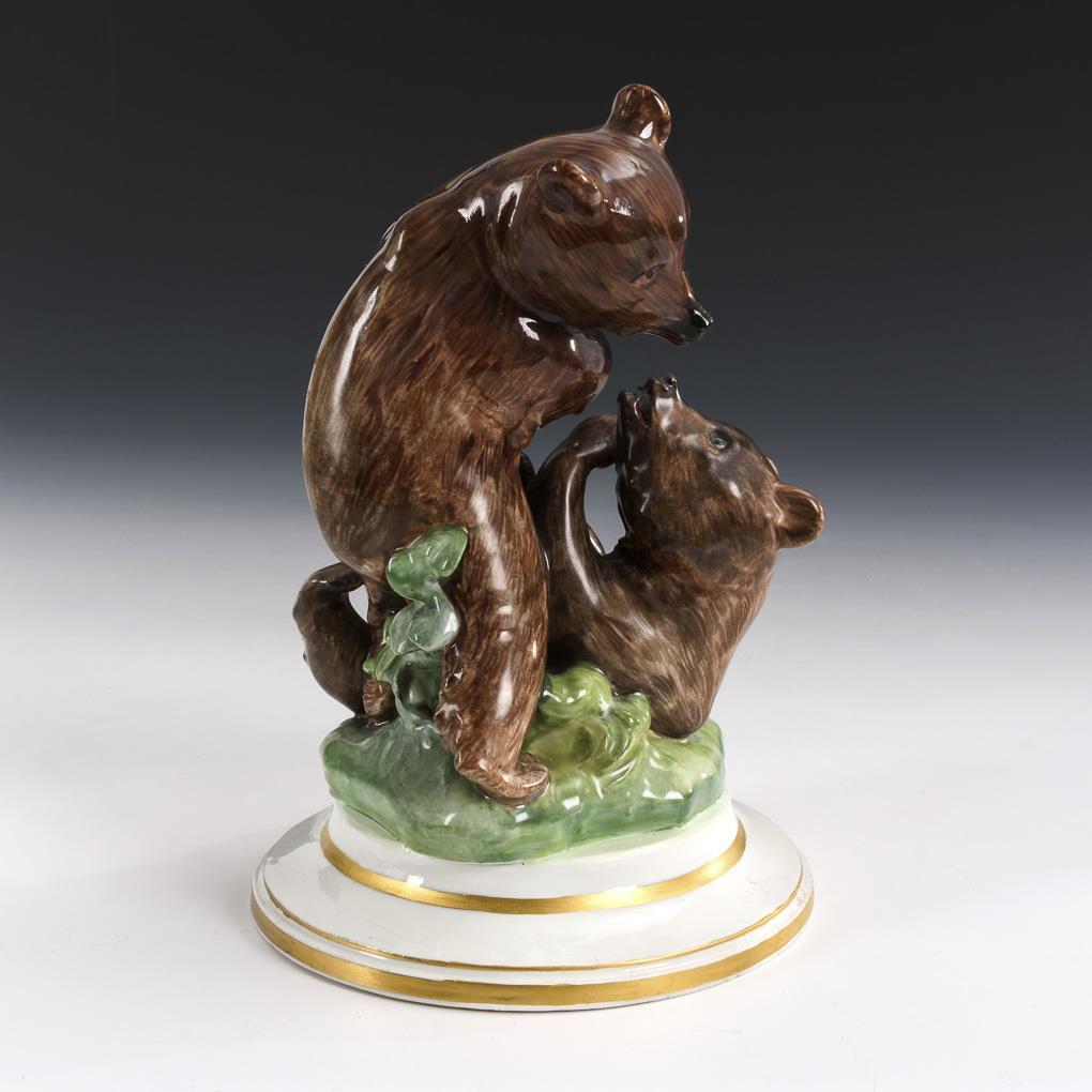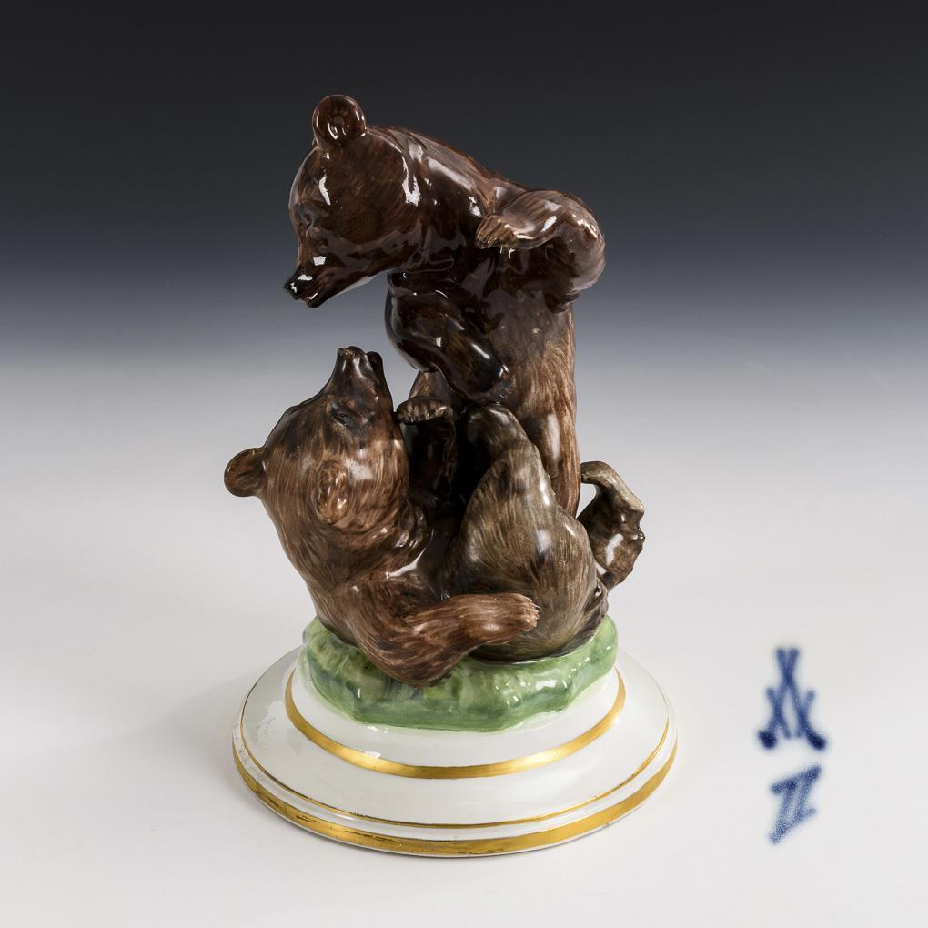 Two bears playing with each other on a natural base, on a later supplemented, old round plinth. 1 Bear head and arm and natural base and round plinth restored.