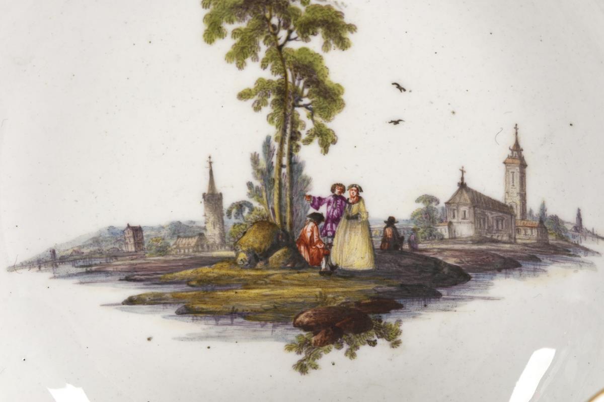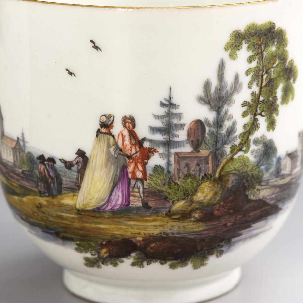 Bell cup with rocaille fiefdom. Schauseitig on the cup as well as in the mirror of the saucer the representation of a river landscape with architecture and Personenstaffage.