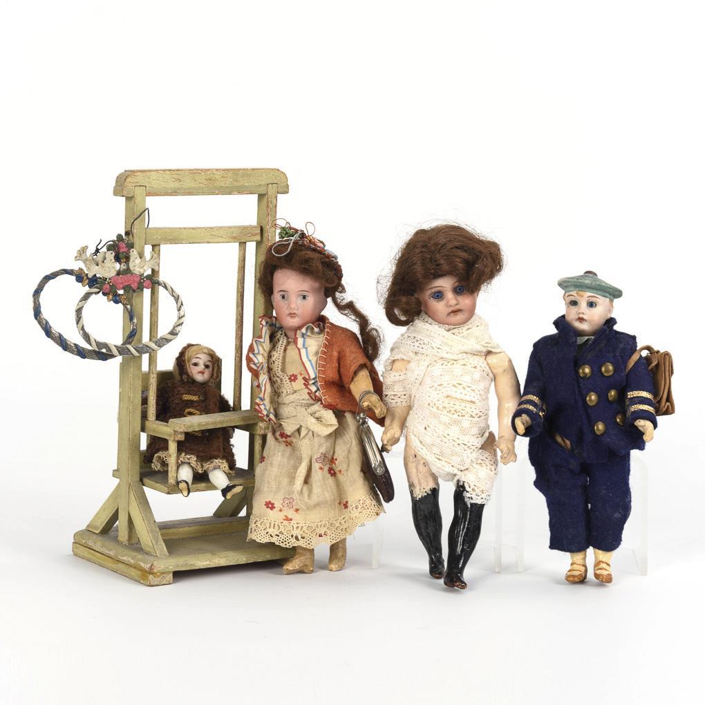 4 different dolls, including 1 sailor boy and 1 original dressed girl. In addition, green wooden swing and brown leather bag. Played, with signs of age and small defects.