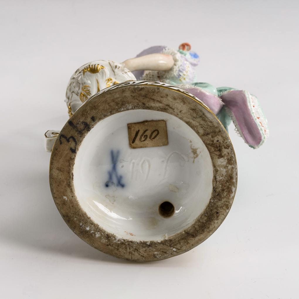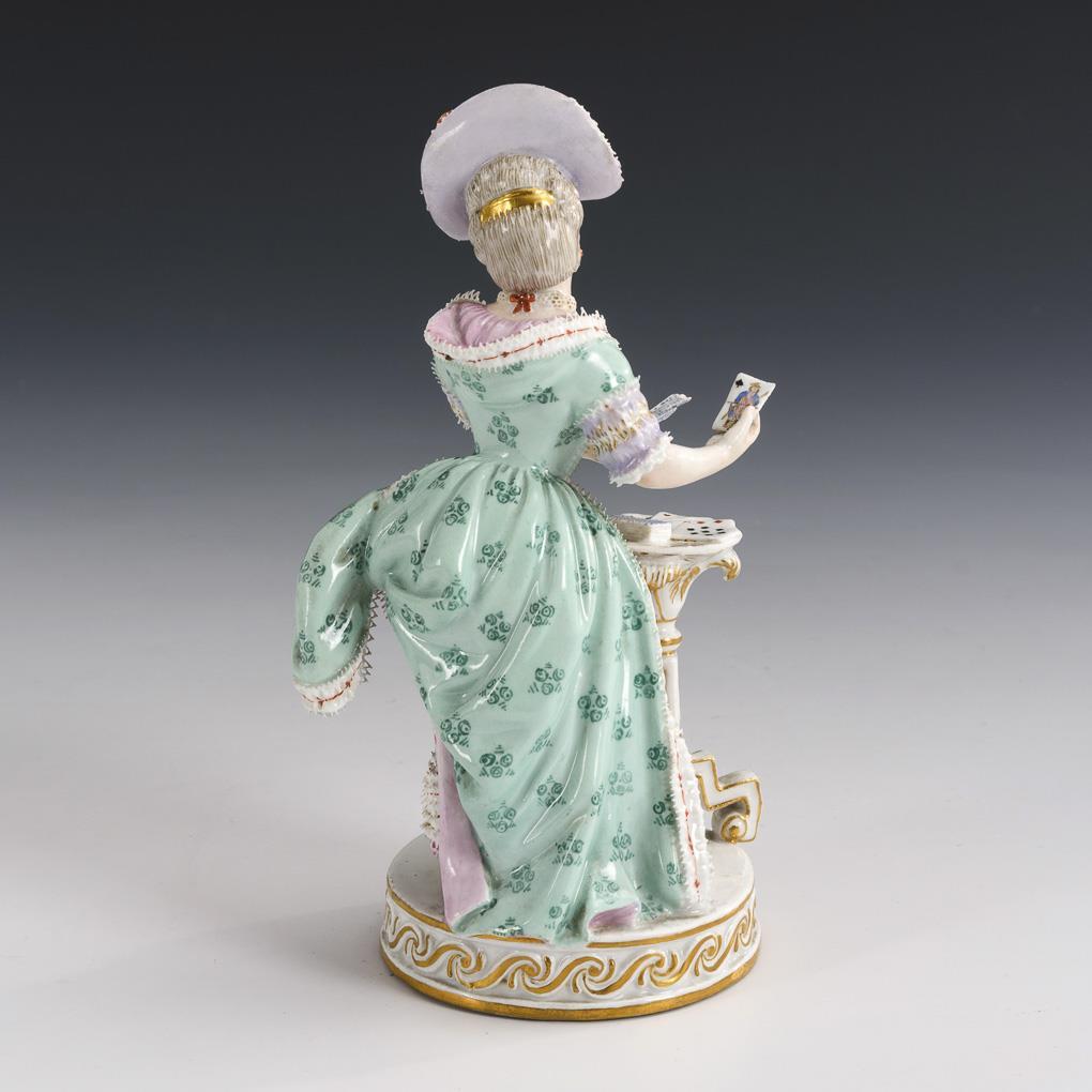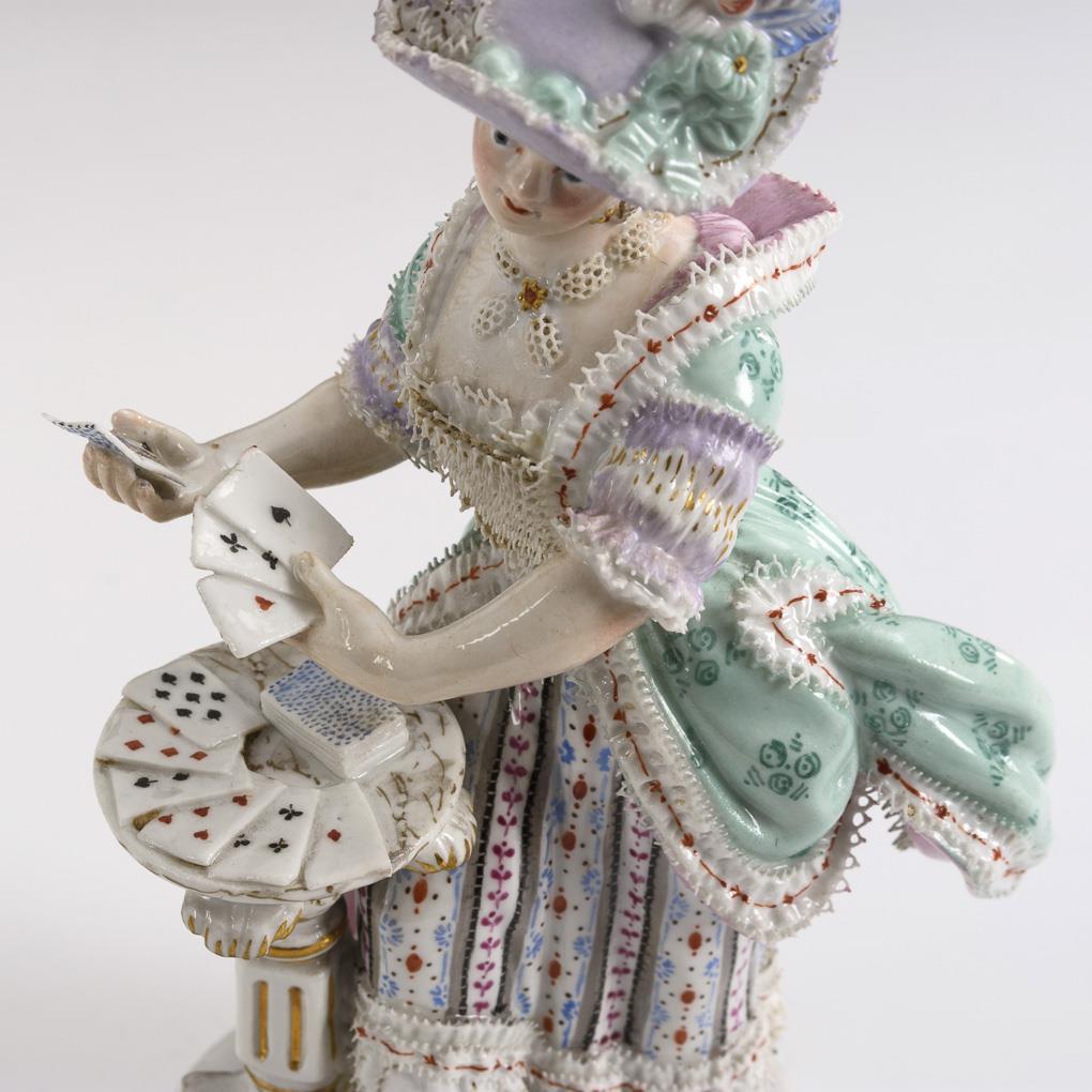 Rococo girl standing at a table, holding cards in her hand, lying on the table cards. Minimal bumps on the top.