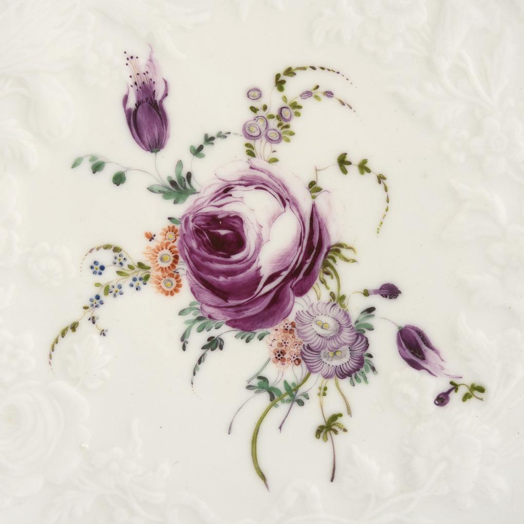 Dinner plate with floral relief and a bouquet of flowers with rose and auricula in the mirror.