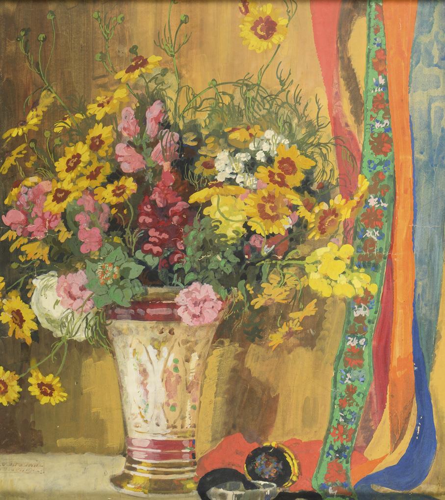 Indistinctly signed: Still life with cockade flowers in crater vase