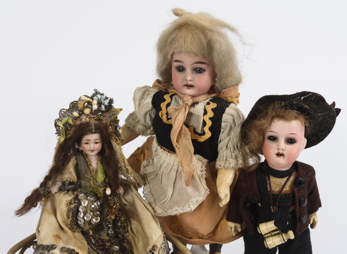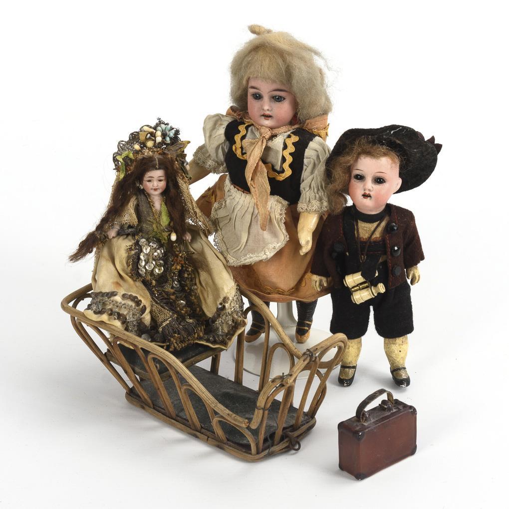 3 different dolls with glass eyes, mohair hair and modeled shoes. All originally dressed in traditional costume or traditional costume style. In addition, small Goebel suitcase and rattan sleigh attachment. Traces of age, small defects.