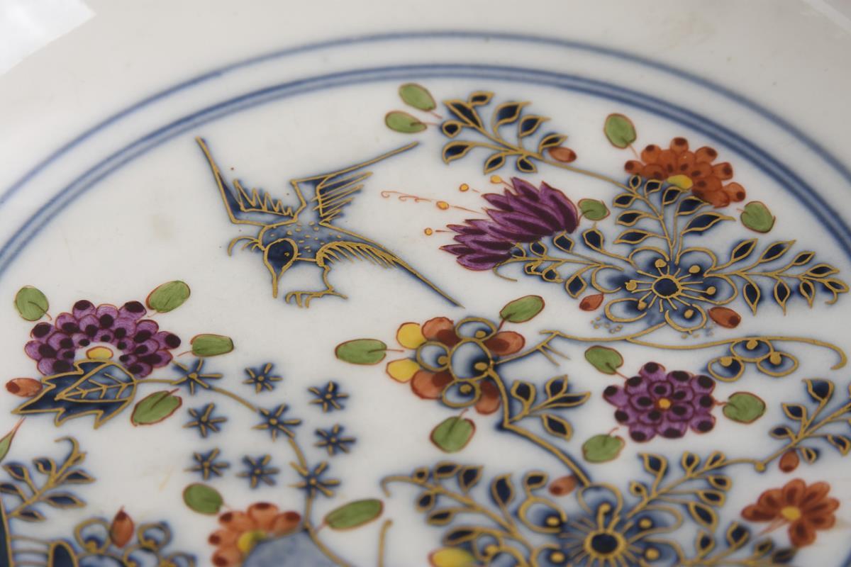 Underglaze blue rock and bird painting, polychrome onglaze painting, gold staffage. H Koppchen 4,5 cm, Ø saucer 13 cm.