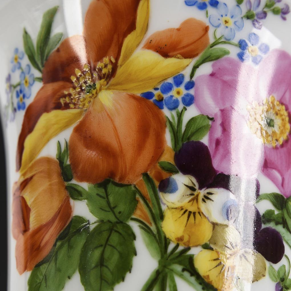 Footed bell cup with leaf handle. On the front a bouquet of flowers with dog rose, horned violet and forget-me-not, richly decorated with gold. Minimal gold abrasion, foot restored.
