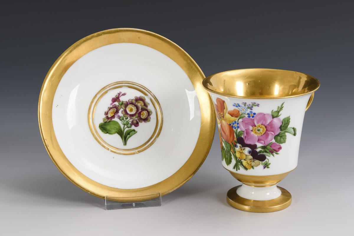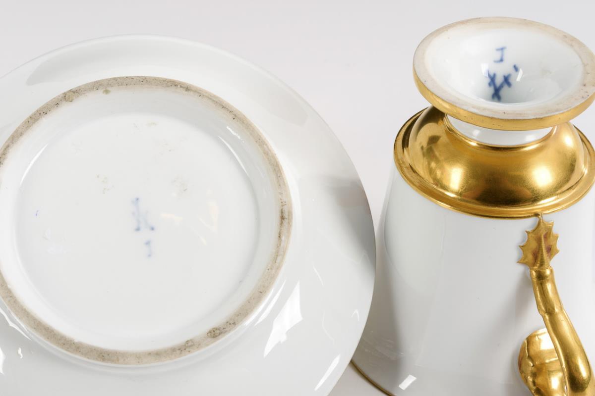 Polychrome painted, gold decorated. H cup 9 cm, Ø original saucer 13.5 cm.