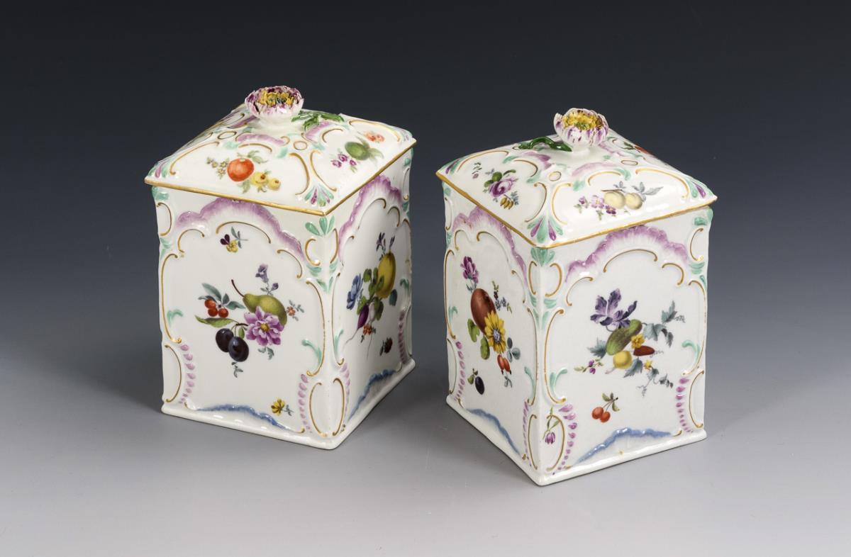 Square box with flower knob lid and rocaille relief. All sides finely painted fruit and flower bouquets. 1x 1 corner restored, 1x restoration on the stand, both lids restored, flowers bumped.