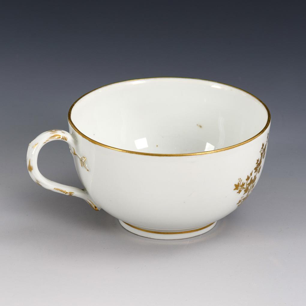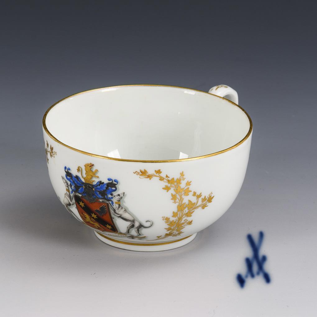 Bellied cup with branch handle. On the front the coat of arms of the Frenkel family held by two greyhounds with lion and half eagle. Without saucer.