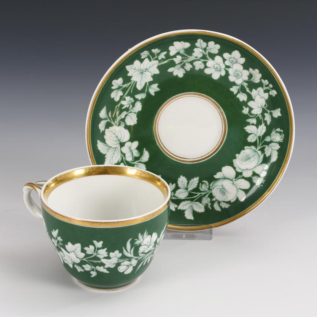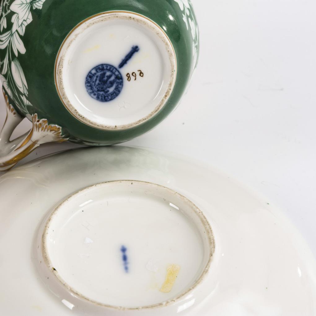 Green and gold staffage. H cup 6,5 cm, Ø original saucer 14,5 cm.