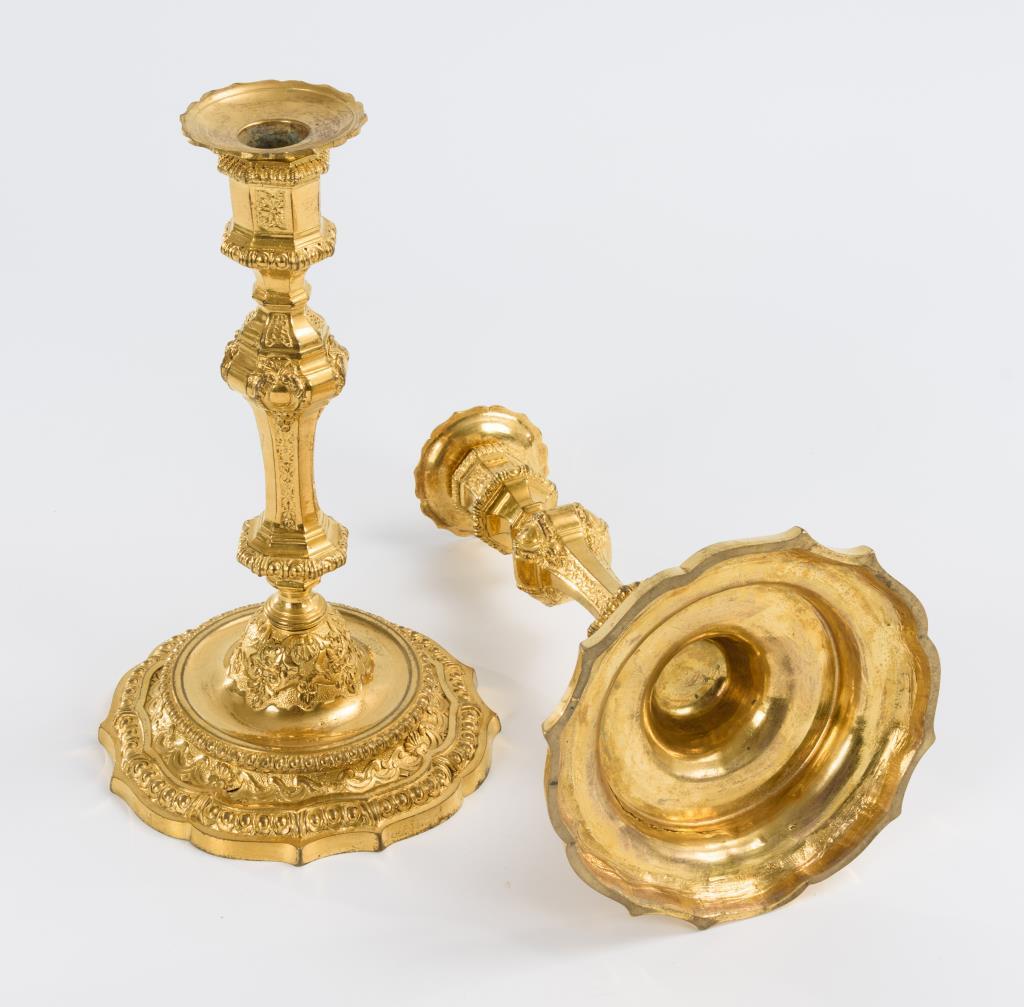 Reich reliefierte Leuchter mit passigem Rundfuß und oktogonalem Balusterschaft. 1 fachgerecht reparierte Bruchstelle am Schaft, 1 Haarriss am Fuß.