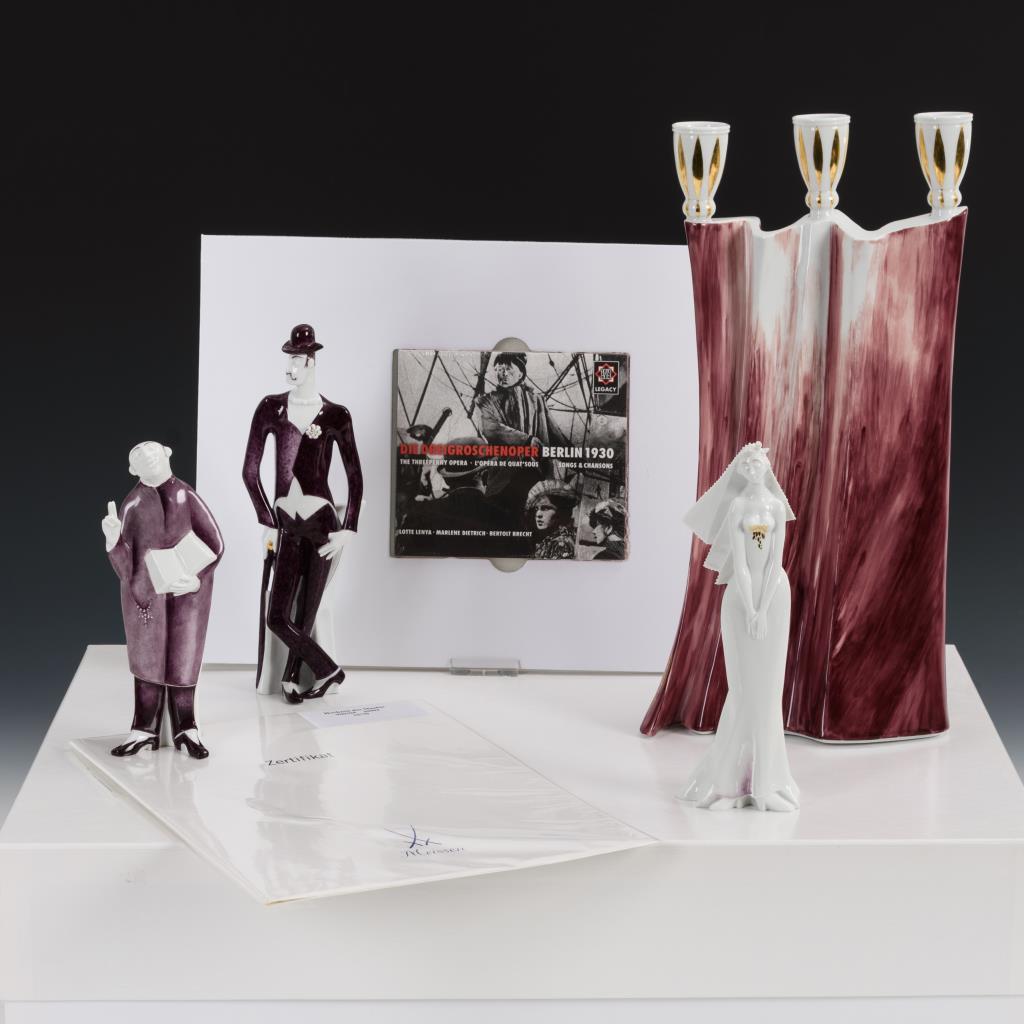 Vorhang als 3-flammiger Leuchter (H 34,5 cm) sowie die Figuren des Mackie, seiner Braut Polly und des Pfarrers Kimball (H 17-22 cm) aus der "Dreigroschenoper" von Bertolt Brecht. Dazu gehört eine CD mit einer historischen Aufnahme der "Dreigroschenoper" aus den 1930er Jahren.