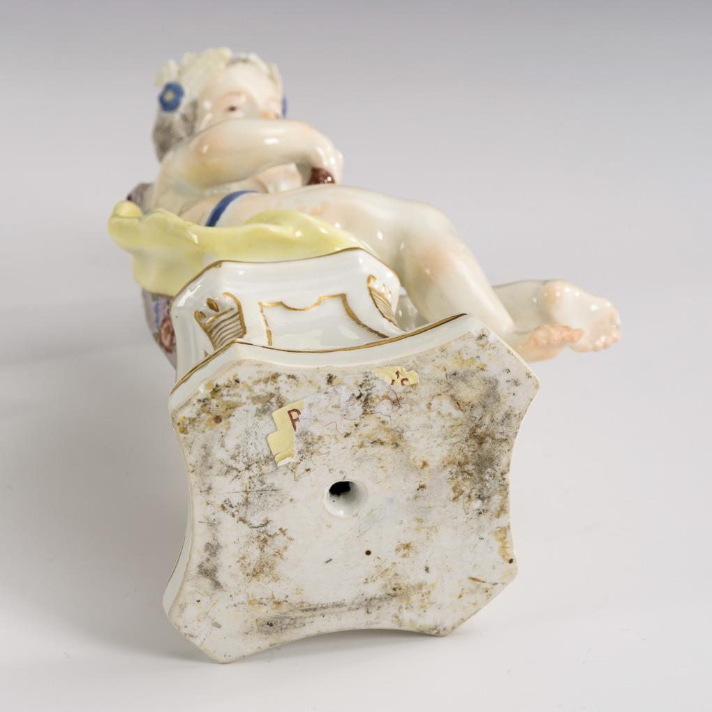 Putto girl sitting on a small pedestal with sickle and sheaf. Some ears and 1 toe bumped.