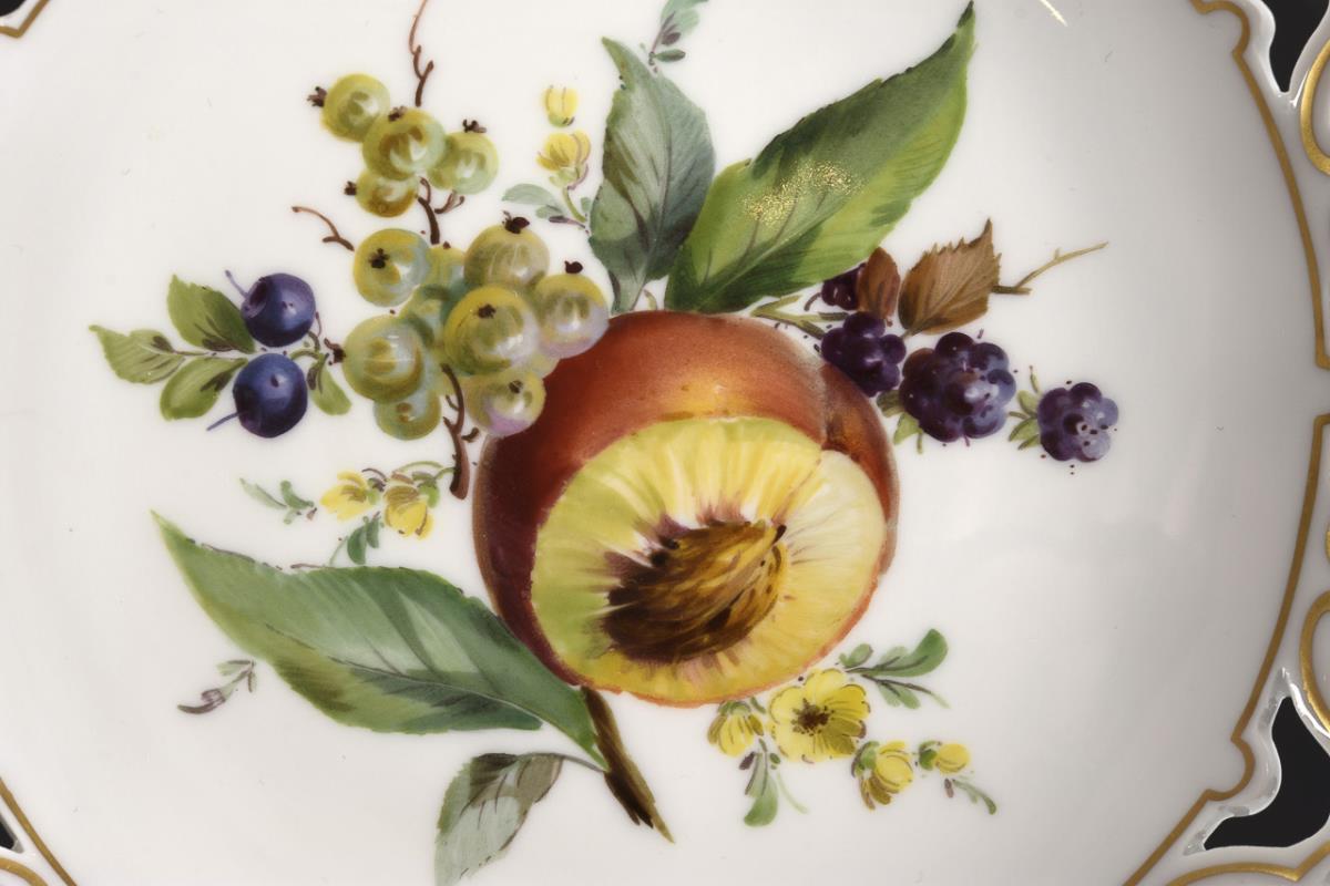 Dish with floral openwork flag and three dolphin feet. In the mirror of the bowl a bouquet of fruit with peach, currants, blackberries and blueberries.
