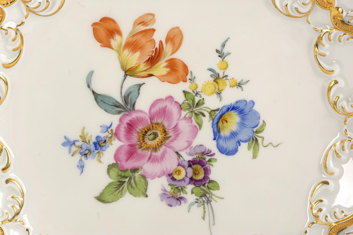 Plate with rocaille relief and a bouquet of flowers with dog rose, tulip and funnel vine in the mirror.