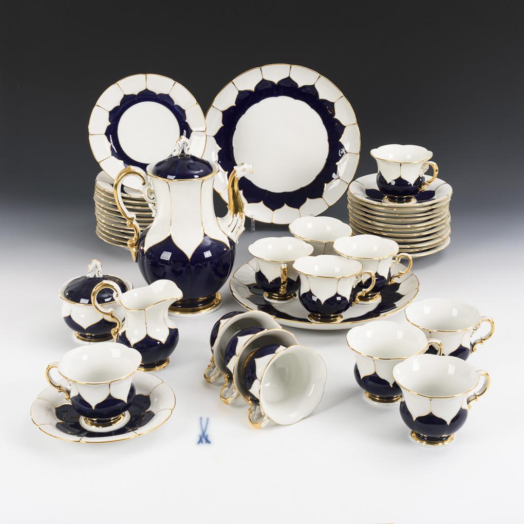 41 pieces. Coffee pot (h 25.5 cm), creamer, sugar bowl, 12 cups, 12 saucers, 12 breakfast plates and 2 cake plates (Ø 26 cm). Minimal rubbing on the cobalt partial background of the breakfast plates.