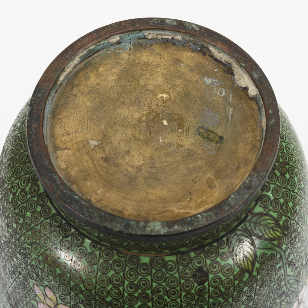 Very fine spiral pattern as background with delicate flowers and butterflies in yellow, pink and white. Brass with light patina.