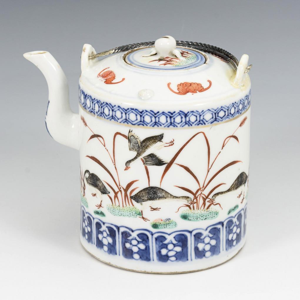 Patterned edges in underglaze blue, fine bird and bat painting. Small, flat lid with peach handle. One eyelet for metal handle restored.