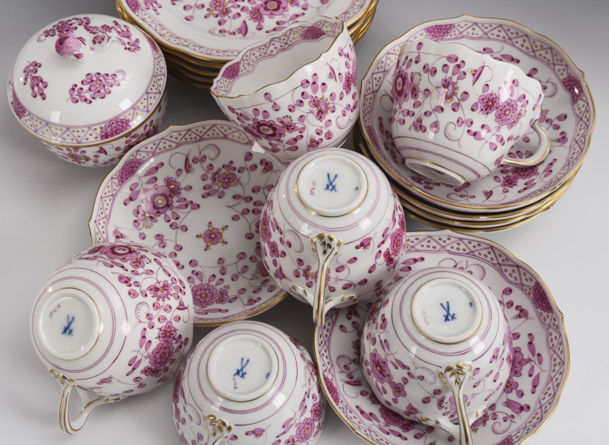 22 pieces. Form "New cutout". Mocha pot (h 21.5 cm), creamer, sugar bowl, 6 cups, 6 saucers, 6 cake plates and 1 credenza plate.