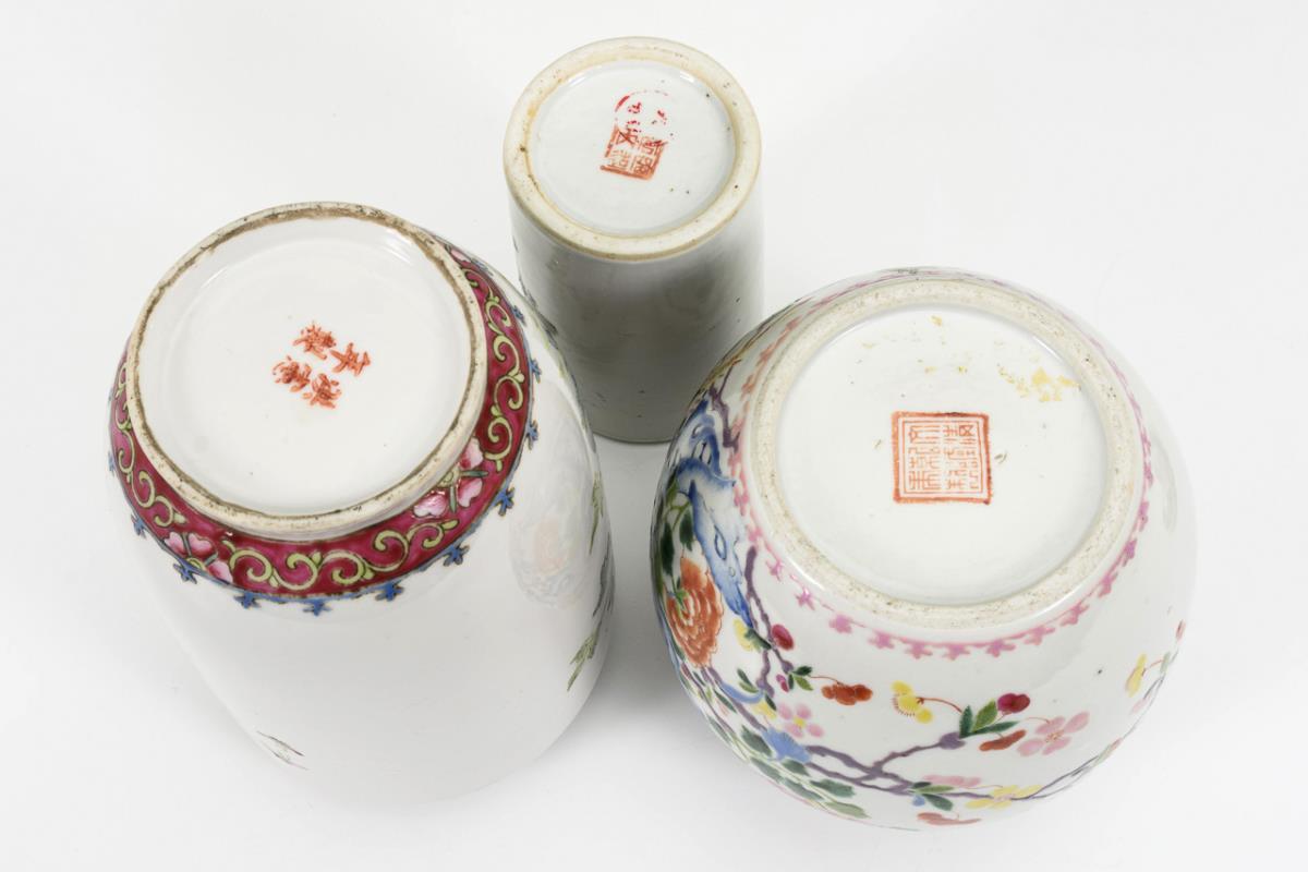 Small cylinder vase with bird on flower. Somewhat rubbed. / Round vase with pair of phoenixes on flower branches. Lid is missing. / Tall vase with flower piece and lid. Small hairline crack on the upper rim.