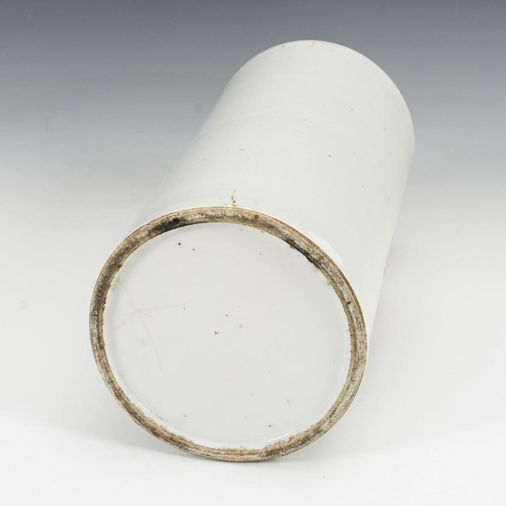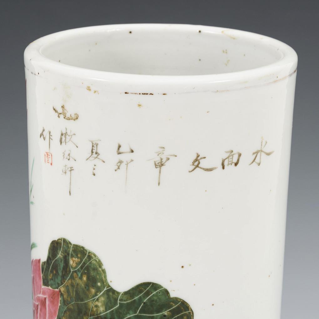 Red lotus blossoms and aquatic plants, top right line of writing. Upper gold rim rubbed, small spider on bottom, touch of ash in glaze.