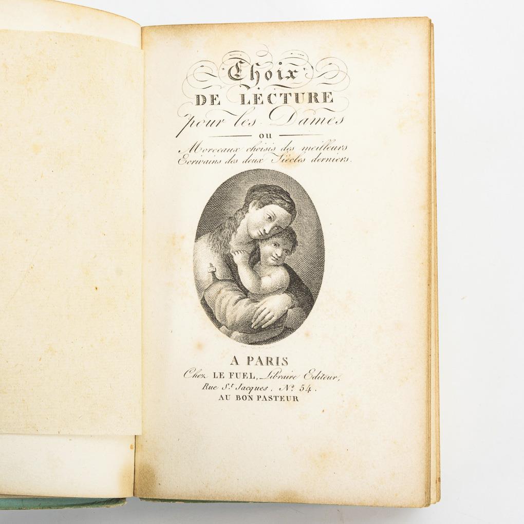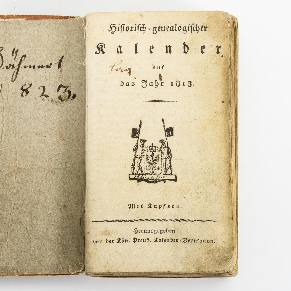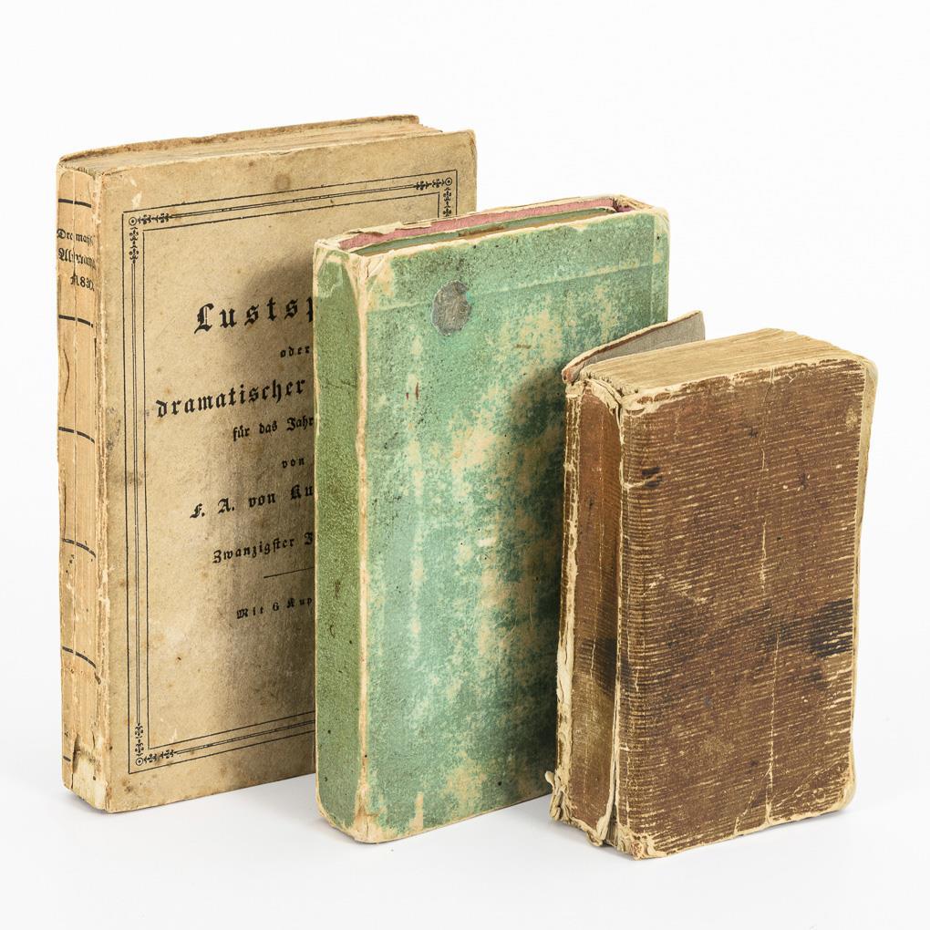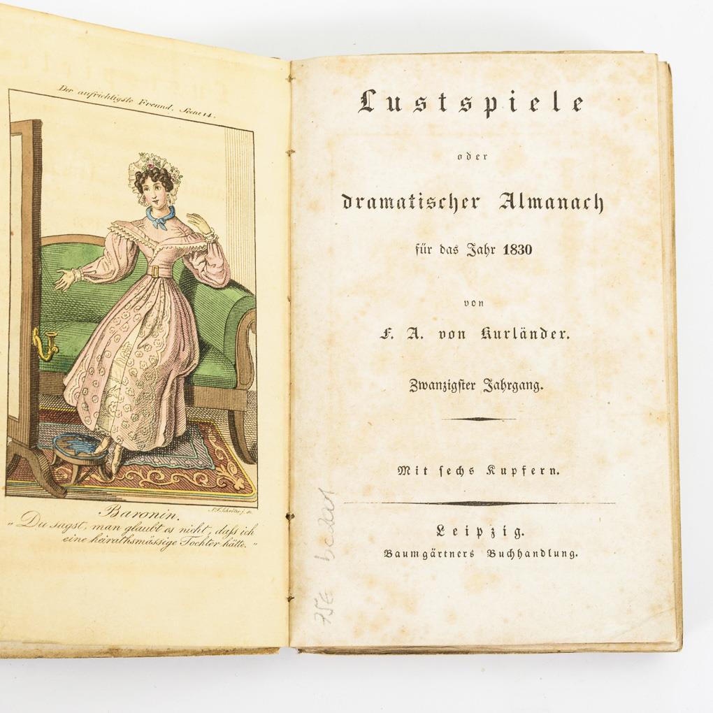 "Lustspiel oder dramatischer Almanach für das Jahr 1830" by F.A. von Kurländer, Baumgärtners Buchhandlung, Leipzig. 20th ed. 10, 406 pages and 6 colored engravings / "Historisch-genealogischer Kalender auf das Jahr 1813". Published by the Königl. Preuß. Deputation, 9 copper engravings. Heavy signs of wear / "Choix de lecture pour les Dames" Paris, Chez le Fuel. 251 pages and 6 copper engravings. In green paperback with slipcase and gilt edges. Signs of use.
