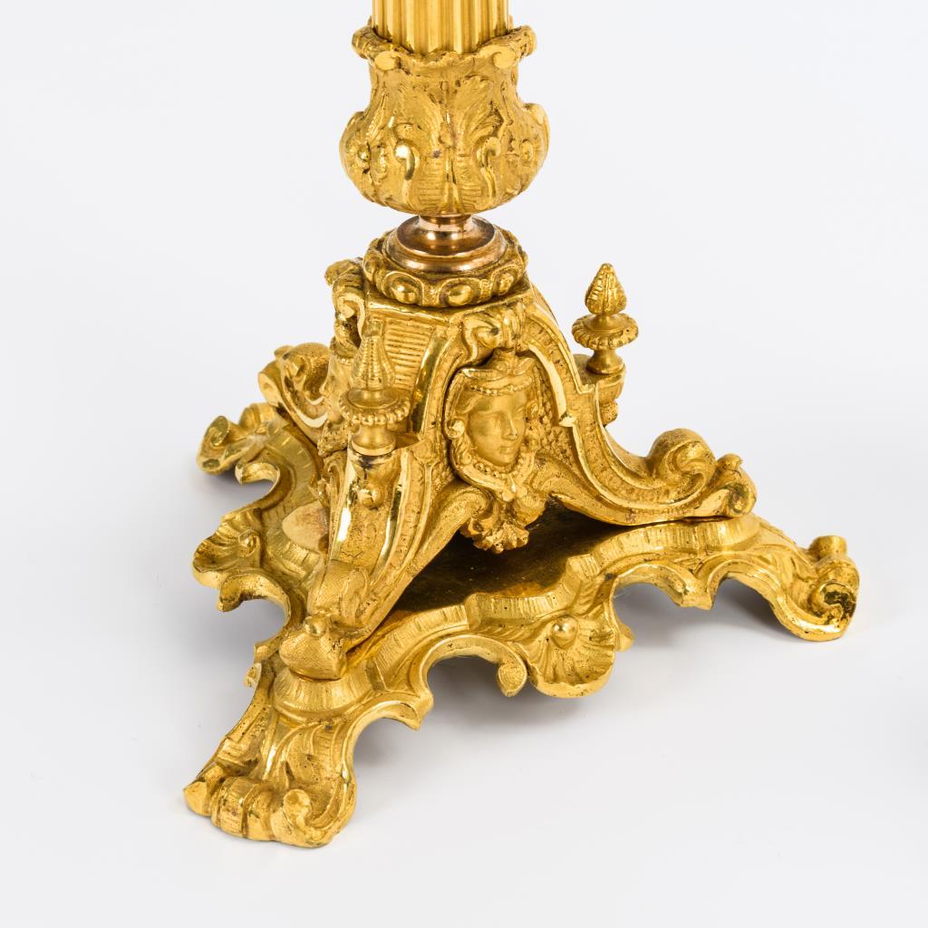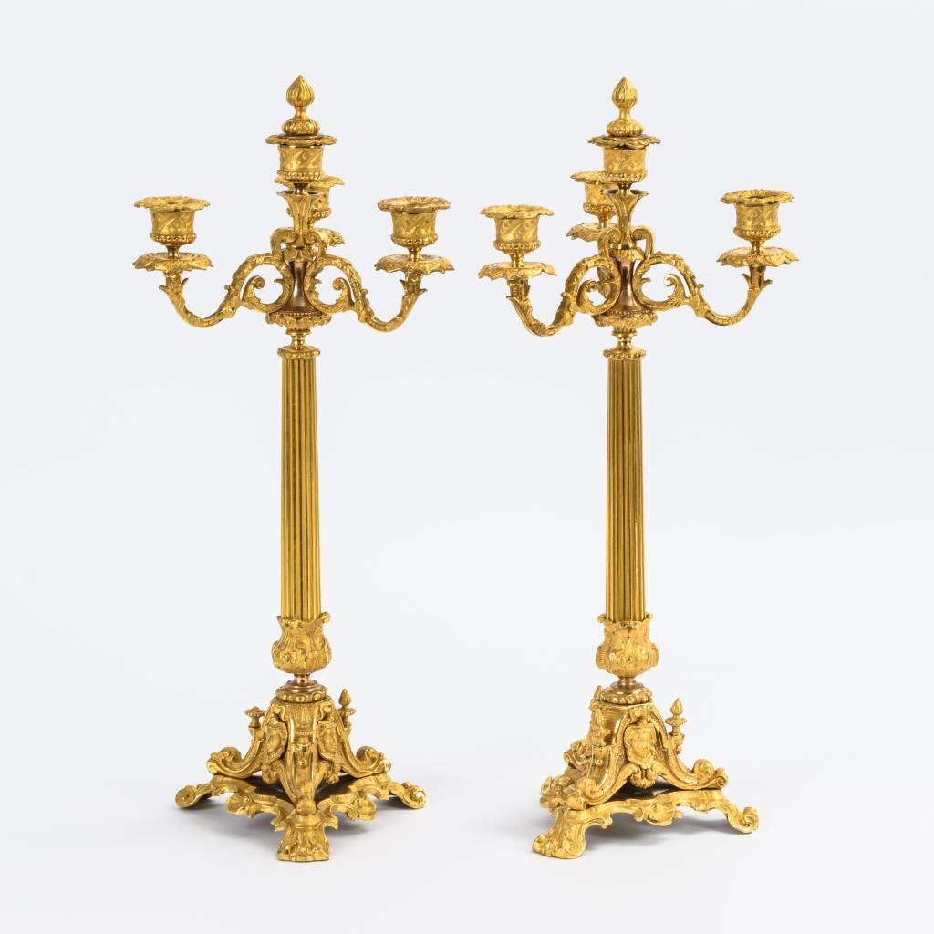 Überaus reich reliefierte Bronzeleuchter. 3-passiger Fuß mit Maskaronen auf entsprechender Plinthe, Säulenschaft, 3 Volutenarme, erhöhte Zentraltülle je mit originalem Flammenlöscher.