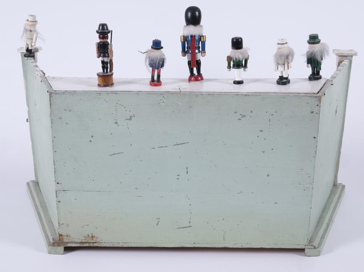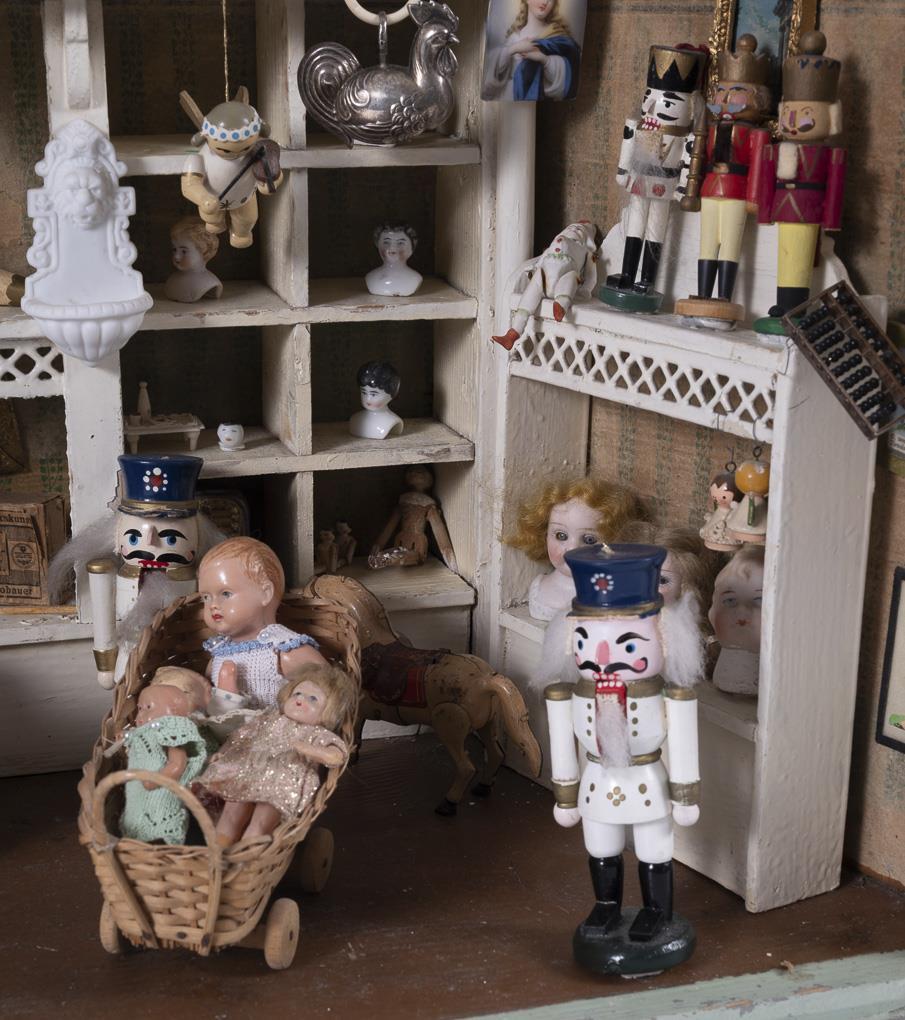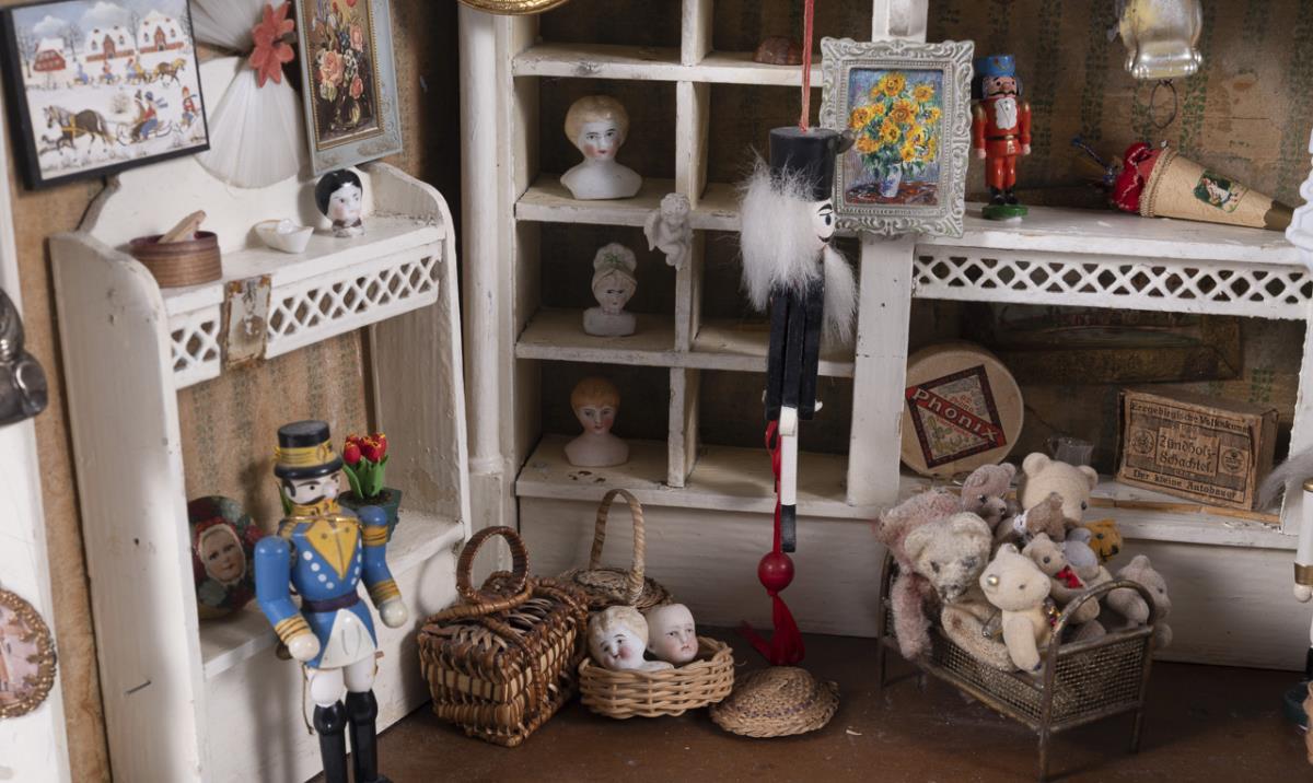 Trapezoidal case with fixed shelf. Set up as a toy store with nutcrackers, dolls, teddy bears, doll heads etc. Played, signs of age, small defects.