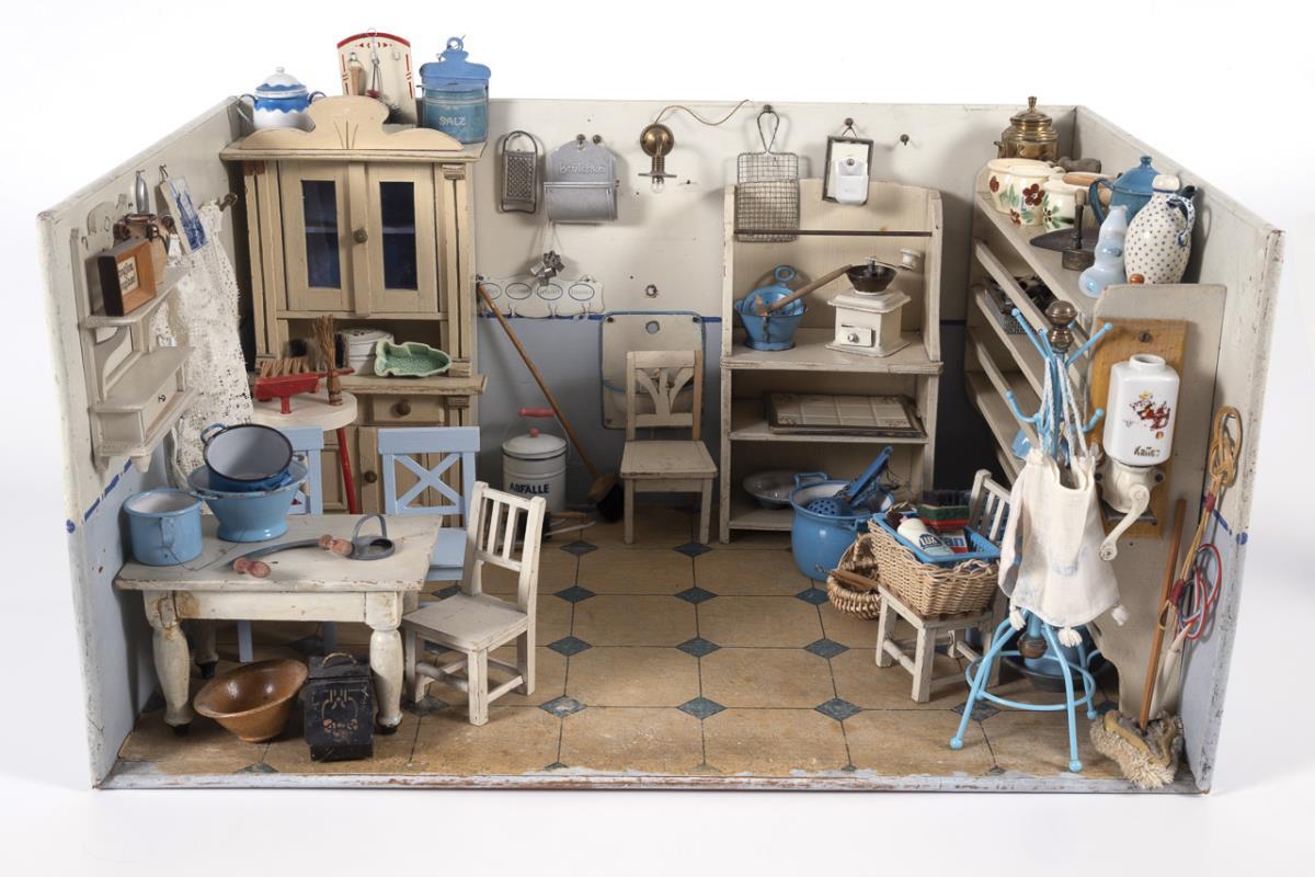 Large cabinet with 2 glazed windows, curtain and wall lamp. Furnished with bright kitchen furniture, blue enameled dishes and numerous accessories. Marks of age, some small defects.