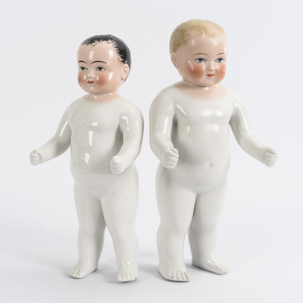 2 unbekleidete "Nacktfösche" (sogenannte "Frozen Charlotte"), 1x blonde und 1x schwarze Haare, L 39 und 43 cm. Kleine blonde Badepuppe mit schönem alten Samtanzug mit Cape, L 26,5 cm. Große blonde Puppe fachgerecht restauriert, 1x kleiner Chip am Fuß.