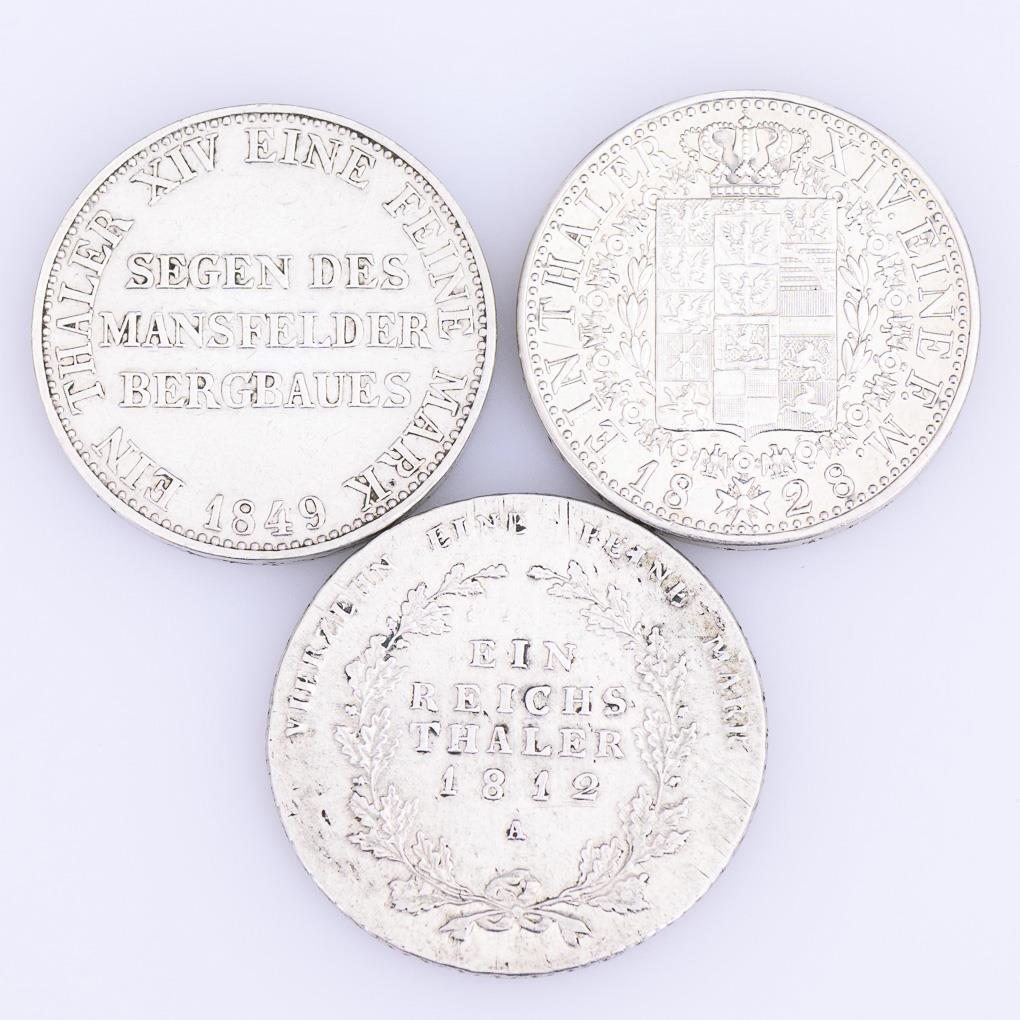 "Ein Thaler, XIV Eine feine Mark 1828", "Friedr. Wilhelm III Koenig v. Preussen" / "Ein Thaler XIV Eine feine Mark, 1849, Segen des Mansfelder Bergbaues", "Friedr. Wilhelm IV Koenig v. Preussen" / "Ein Reichsthaler 1812", Friedr. Wilhelm III Koenig von Preussen". Condition: very nice.
