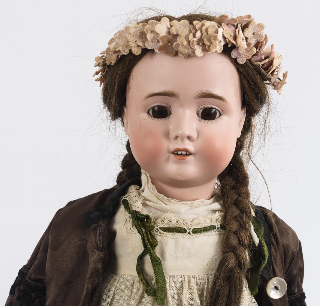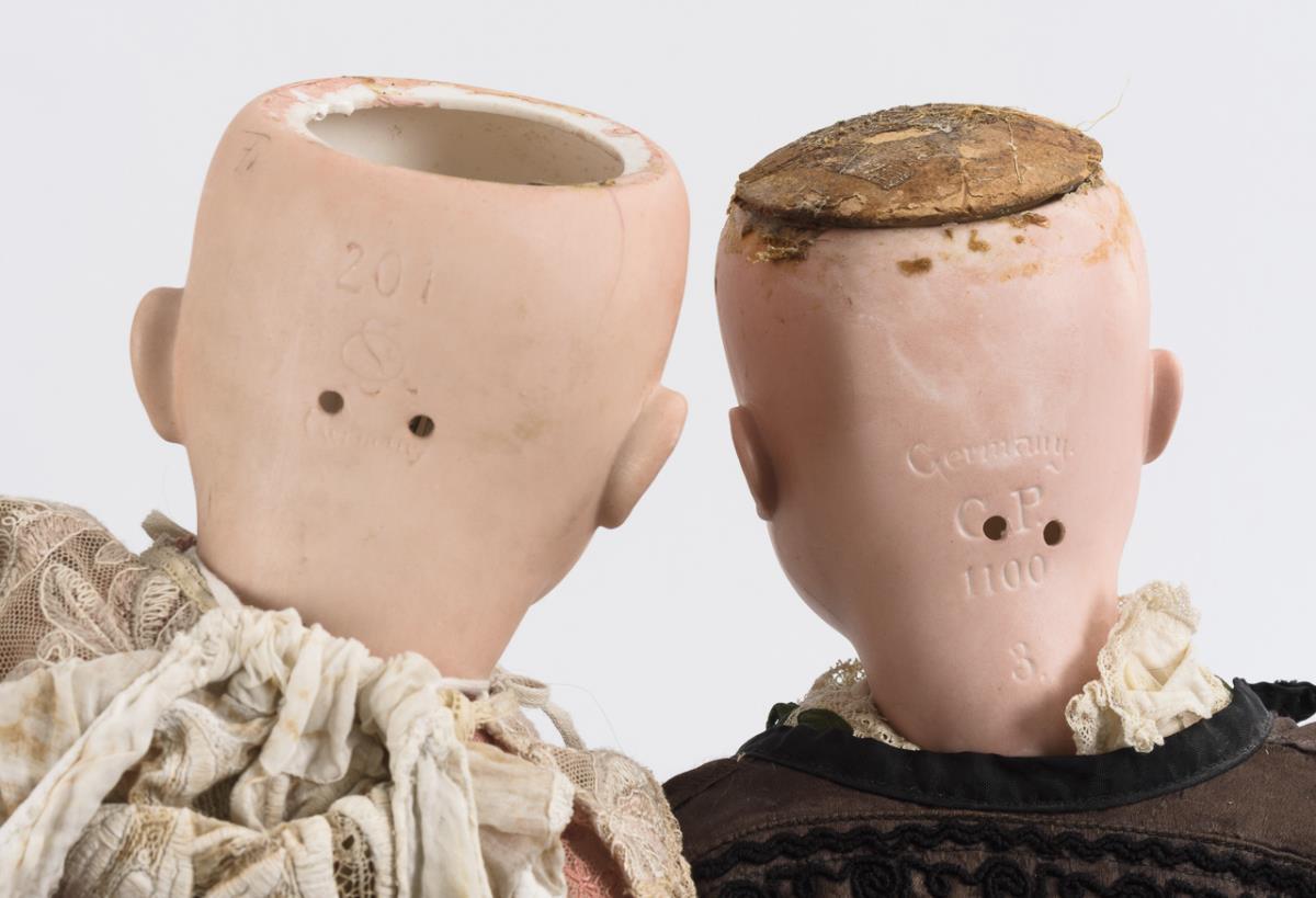 Both with crank head and brown sleeping eyes. 1x brown human hair wig, 15-piece link body and white dress, brown coat. 1x medium blonde mohair wig, 5-piece sitting baby body and pink dress. SQ with hairline crack at the back of the head.