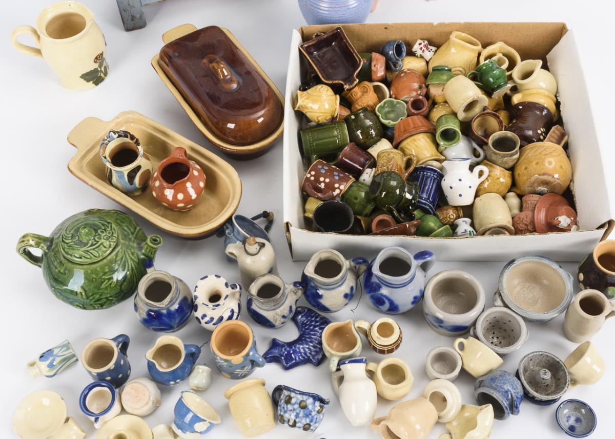 Farmer's cabinet, bath doll and convolute dollhouse dishes.