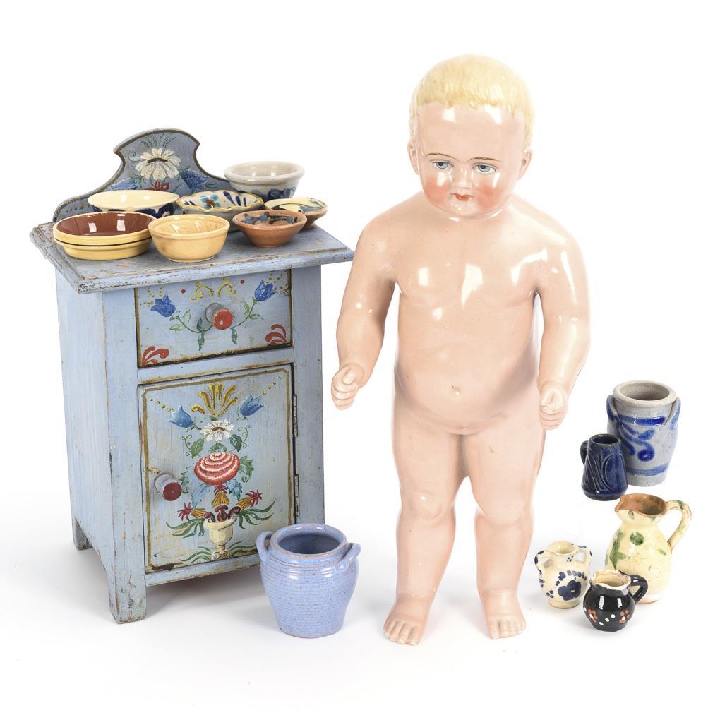Light blue cabinet with floral painting (30,5 x 18,5 x 15,5 cm). Pink tinted bath doll (Frozen Charlotte) with blond hair (L 38 cm). In addition, extensive Konvolut peasant ceramic tableware. Bathing doll with 2 support traces? on the back, buttocks minimally rubbed, right thumb bumped. Harness with small bumps.
