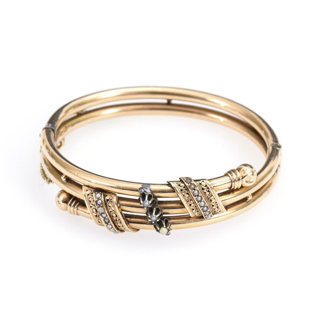 Oval hinged hoop worked in hollow form with pearl trim. Box lock with supplemented safety chain. Scattered wear marks, pearl partially rubbed.