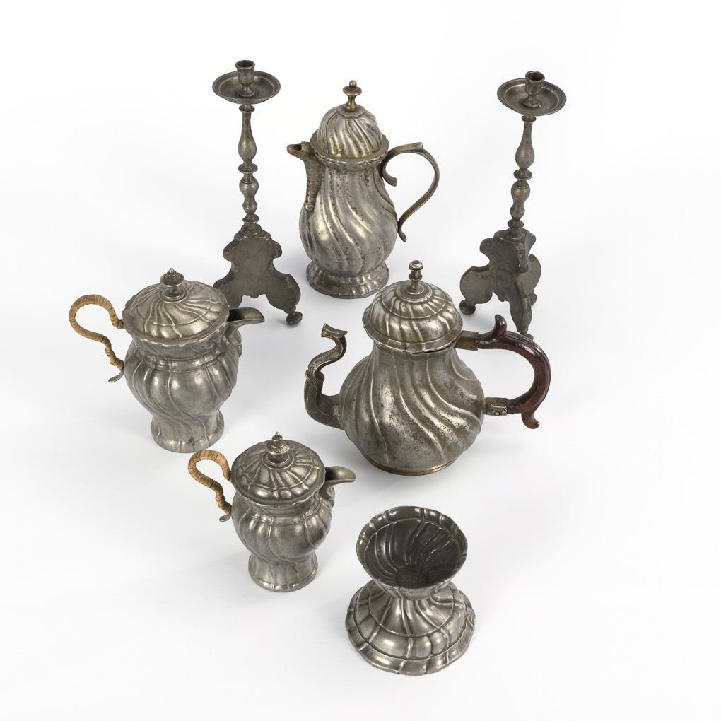 Each in baroque forms. 4 godroned jugs (1x with wooden handle, 2x wrapped in raffia), 1 saliere, 1 pair of candlesticks with very small spouts. Wooden handle supplemented, 1 with wall cracks, some traces of soldering. Each signs of age / use.